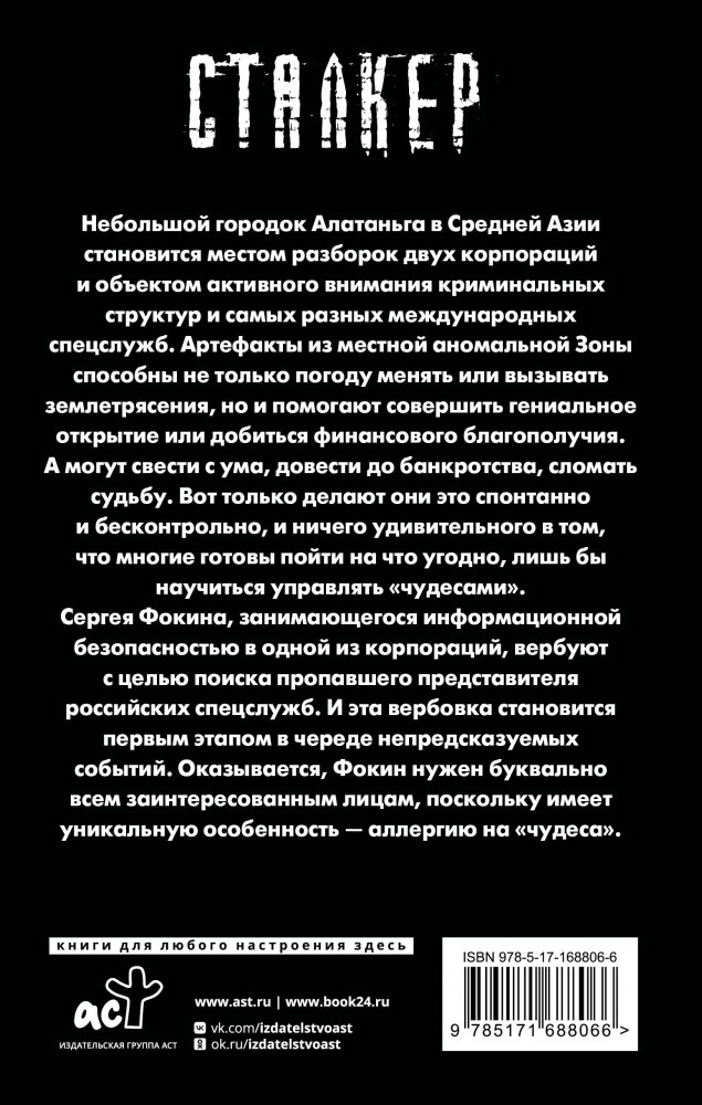 💳 Оплатить за товар можно при получении 🇰🇿 Есть бесплатная доставка по Казахстану от 1 дня 🎁 Копите бонусы с каждой покупки Серия: Сталкер Небольшой городок Алатаньга в Средней Азии становится местом разборок двух корпораций и объектом активного внимания криминальных структур и самых разных международных спецслужб. Артефакты из местной аномальной Зоны способны не только погоду менять или вызывать землетрясения, но и помогают совершить гениальное открытие или добиться финансового благополучия. А могут свести с ума, довести до банкротства, сломать судьбу. Вот только делают они это спонтанно и бесконтрольно, и ничего удивительного в том, что многие готовы пойти на что угодно, лишь бы научиться управлять «чудесами». |