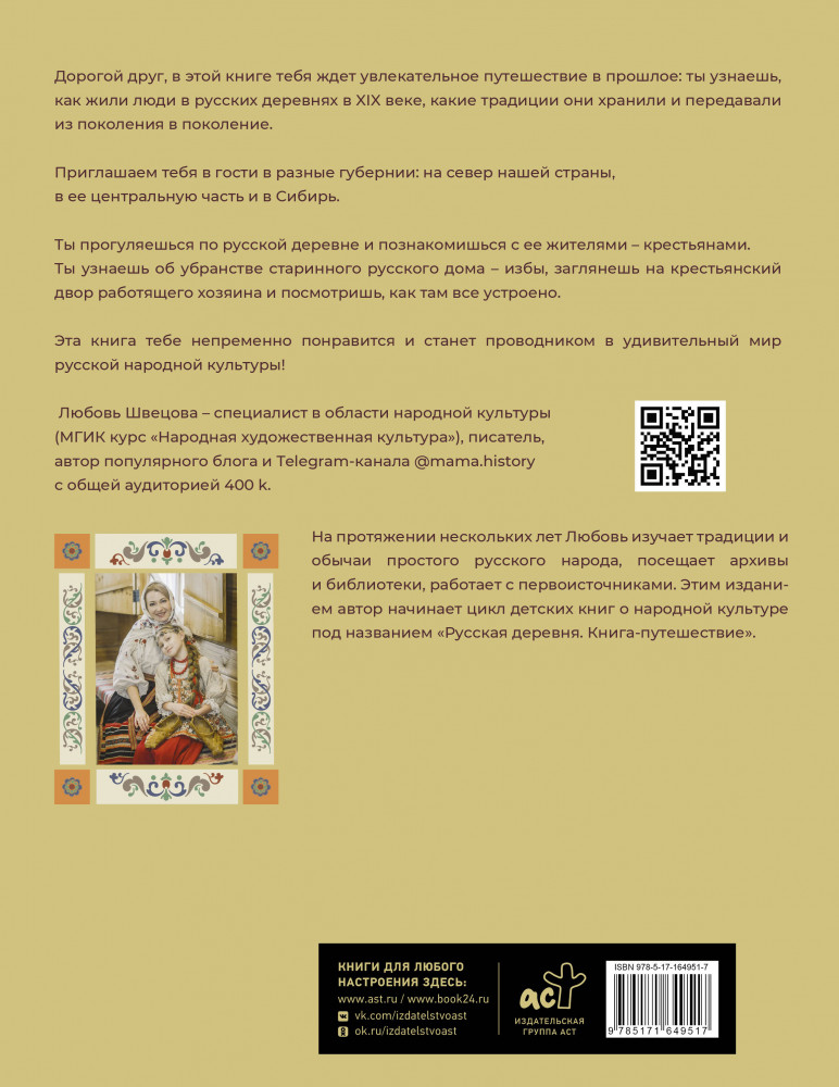 💳 Оплатить за товар можно при получении 🇰🇿 Есть бесплатная доставка по Казахстану от 1 дня 🎁 Копите бонусы с каждой покупки Серия: Изучаем вместе Дорогой друг, в этой книге тебя ждет увлекательное путешествие в прошлое: ты узнаешь, как жили люди в русских деревнях в XIX веке, какие традиции они хранили и передавали из поколения в поколение. Приглашаем тебя в гости в разные губернии: на север нашей страны, в ее центральную часть и в Сибирь. Ты прогуляешься по русской деревне и познакомишься с ее жителями — крестьянами. Ты узнаешь об убранстве старинного русского дома — избы, заглянешь на крестьянский двор работящего хозяина и посмотришь, как там все устроено. Эта книга тебе непременно понравится и станет проводником в удивительный мир русской народной культуры! |