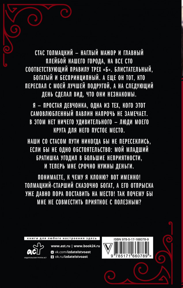 💳 Оплатить за товар можно при получении 🇰🇿 Есть бесплатная доставка по Казахстану от 1 дня 🎁 Копите бонусы с каждой покупки Серия: Твоя любовь Стас Толмацкий — наглый мажор и главный плейбой нашего города, на все сто соответствующий правилу трех «Б». Блистательный, богатый и беспринципный. А еще он тот, кто переспал с моей лучшей подругой, а на следующий день сделал вид, что они незнакомы. Я — простая девчонка, одна из тех, кого этот самовлюбленный павлин напрочь не замечает. В этом нет ничего удивительного — люди моего круга для него пустое место. Наши со Стасом пути никогда бы не пересеклись, если бы не одно обстоятельство: мой младший братишка угодил в большие неприятности, и теперь мне срочно нужны деньги. Понимаете, к чему я клоню? Вот именно! Толмацкий старший сказочно богат, а его отпрыска уже давно пора поставить на место! Так почему бы мне не совместить приятное с полезным? |