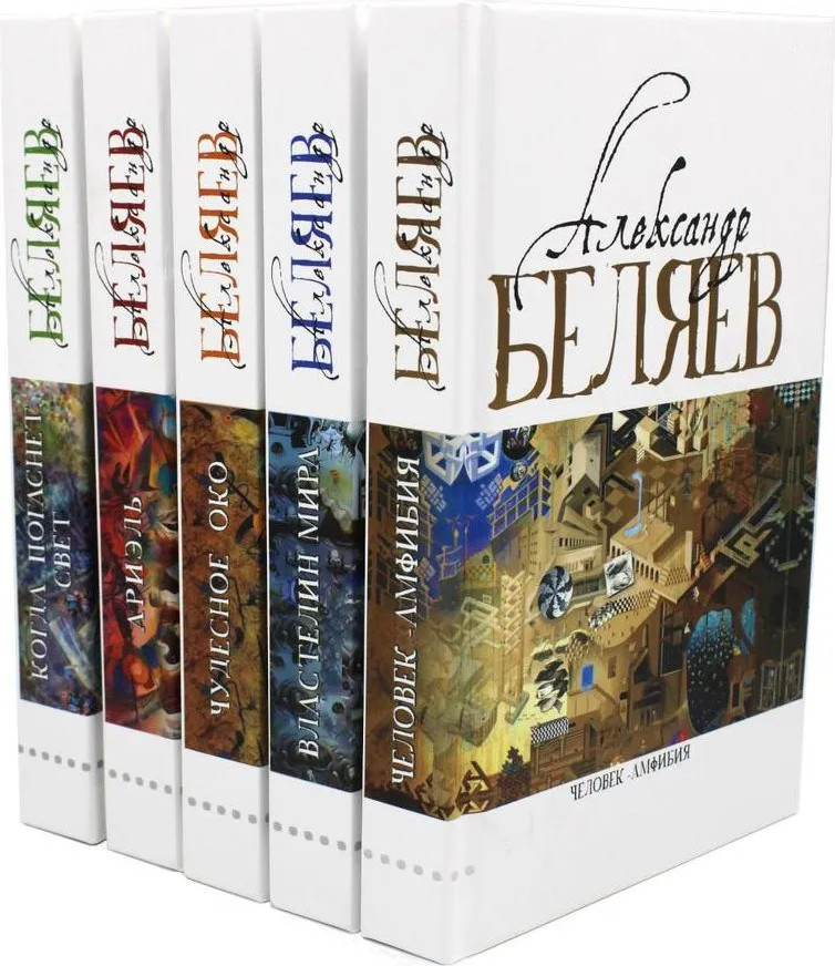 Александр Романович Беляев (1884-1942) — один из основоположников жанра научной фантастики в нашей стране. Прикованный к постели писатель жил в изумительном мире, созданном его воображением. Силой своей фантазии он рисовал будущее, предвосхищая возможность дальнейших открытий и новых достижений. Из пятидесяти научных предвидений Беляева многие сбылись или принципиально осуществимы, и только три считаются ошибочными. Том 1 В данный том Собрания сочинений вошли романы «Голова профессора Доуэля», «Последний человек из Атлантиды», «Человек-амфибия», а также повесть «Остров Погибших Кораблей». Том 2 В данный том Собрания сочинений вошли романы «Вечный хлеб», «Властелин мира», «Золотая гора», «Подводные земледельцы», а также повесть «Продавец воздуха». Том 3 В данный том Собрания сочинений вошли романы «Человек, потерявший лицо», «Прыжок в ничто», «Воздушный корабль» и «Чудесное око». Том 4 В данный том Собрания сочинений вошли романы «Звезда КЭЦ», «Лаборатория Дубльвэ», «Человек, нашедший свое лицо» и «Ариэль». Том 5 В данный том Собрания сочинений вошел роман «Когда погаснет свет», а также рассказы писателя. |