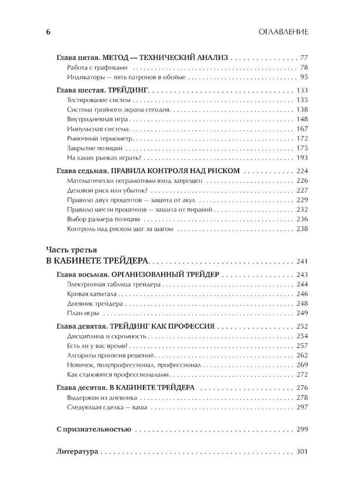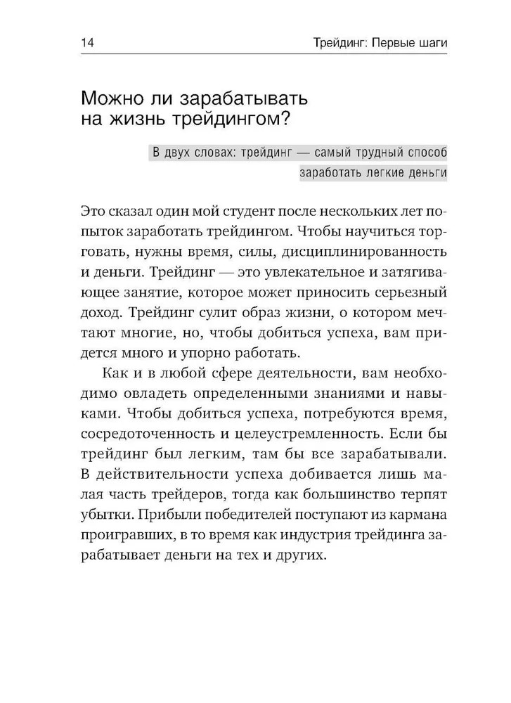 Эта книга поможет вам освоить всё, что необходимо для успеха на финансовых рынках: психологию биржевика, массовую психологию толпы, технические индикаторы и торговые системы, контроль над риском и размещение стоп-приказов. Она включает в себя конкретные инструкции, как организовать свою работу на бирже и как вести учетные записи, чтобы учиться не только на своих победах, но и на ошибках. Дневники шести сделок, проведенных автором, позволят вам отследить ход его мыслей и увидеть, как он шаг за шагом принимает решения о покупке или продаже. Впервые издание этой книги на русском языке включает задачник. Сто вопросов и развернутых ответов, каждый из которых привязан к конкретной главе, позволят вам проверить свой уровень знаний, прежде чем вы будете рисковать деньгами на бирже. Шкалы для самооценок помогут вам понять, в какой степени вы освоили каждый из ключевых аспектов трейдинга. |
