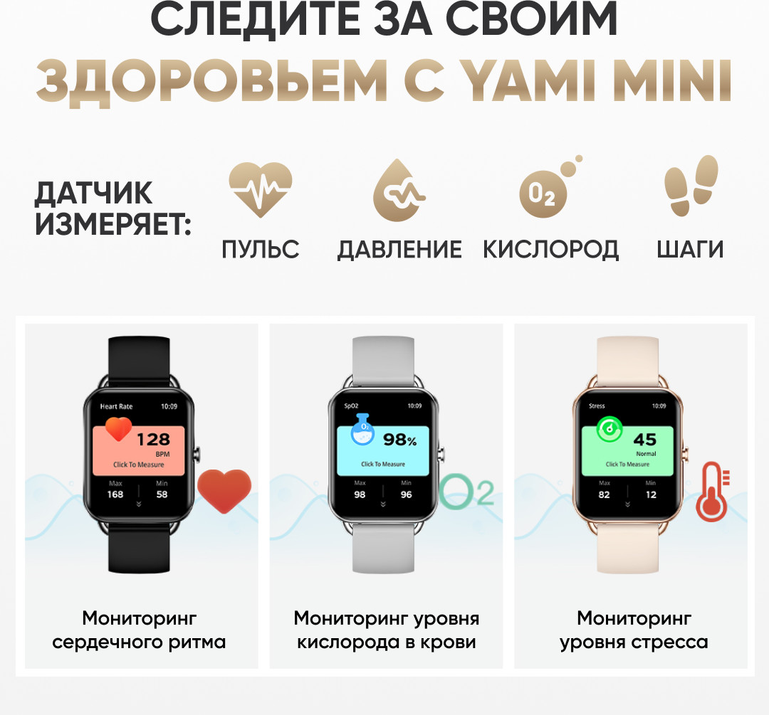 Смарт часы YAMI Mini серии предлагают множество функций для различных сфер жизни: от занятий спортом и фитнесом до туризма и походов. С их помощью можно отслеживать количество пройденных шагов или расстояние, и проверять уровень кислорода в крови и даже анализировать качество сна. Они имеют оптимальный размер, стильно смотрятся на руке и подходят как для взрослых, так и подростков.