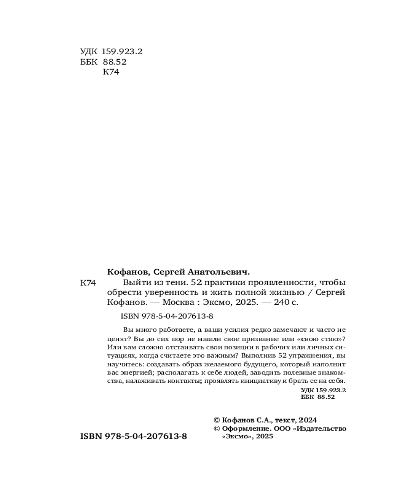 💳 Оплатить за товар можно при получении 🇰🇿 Есть бесплатная доставка по Казахстану от 1 дня 🎁 Копите бонусы с каждой покупки Серия: Top expert. Практичные книги для работы над собой Вы много работаете, а ваши усилия редко замечают и часто не ценят? Вы до сих пор не нашли свое призвание или «свою стаю»? Или вам сложно отстаивать свои позиции в рабочих или личных ситуациях? Причиной чаще всего является неумение проявить себя в нужный момент. Именно этот навык, который вполне можно развить, позволяет жить полной жизнью, достигать видимого результата и при этом оставаться в согласии с собой. |