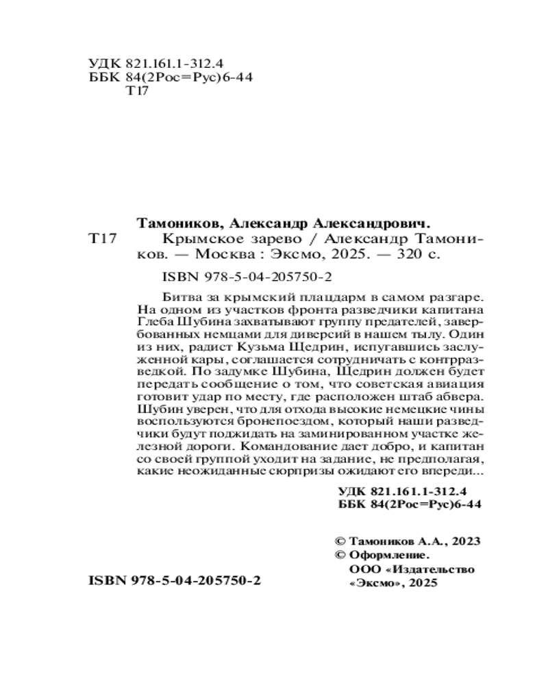 💳 Оплатить за товар можно при получении 🇰🇿 Есть бесплатная доставка по Казахстану 🎁 Копите бонусы с каждой покупки Серия: Фронтовая разведка 41-го. Боевая проза Тамоникова (обложка) Битва за крымский плацдарм в самом разгаре. На одном из участков фронта разведчики капитана Глеба Шубина захватывают группу предателей, завербованных немцами для диверсий в нашем тылу. Один из них, радист Кузьма Щедрин, испугавшись заслуженной кары, соглашается сотрудничать с контрразведкой. По задумке Шубина, Щедрин должен будет передать сообщение о том, что советская авиация готовит удар по месту, где расположен штаб абвера. Шубин уверен, что для отхода высокие немецкие чины воспользуются бронепоездом, который наши разведчики будут поджидать на заминированном участке железной дороги. Командование дает «добро», и капитан со своей группой уходит на задание, не предполагая, какие неожиданные сюрпризы ожидают его впереди... |