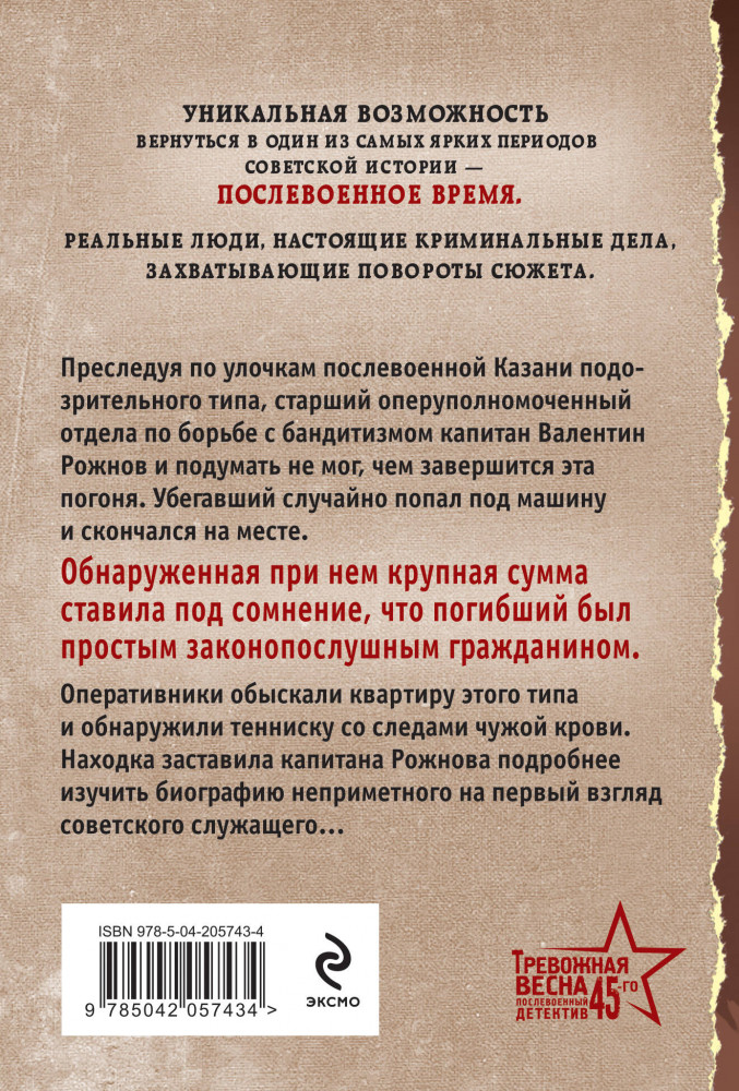 💳 Оплатить за товар можно при получении 🇰🇿 Есть бесплатная доставка по Казахстану от 1 дня 🎁 Копите бонусы с каждой покупки Серия: Тревожная весна 45-го. Послевоенный детектив (обложка) Преследуя по улочкам послевоенной Казани подозрительного типа, старший оперуполномоченный отдела по борьбе с бандитизмом капитан Валентин Рожнов и подумать не мог, чем завершится эта погоня. Убегавший случайно попал под машину и скончался на месте. Обнаруженная при нем крупная сумма ставила под сомнение, что погибший был простым законопослушным гражданином. Оперативники обыскали квартиру этого типа и обнаружили тенниску со следами чужой крови. Находка заставила капитана Рожнова подробнее изучить биографию неприметного, на первый взгляд, советского служащего... |