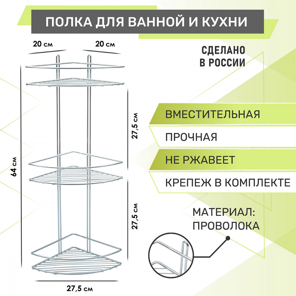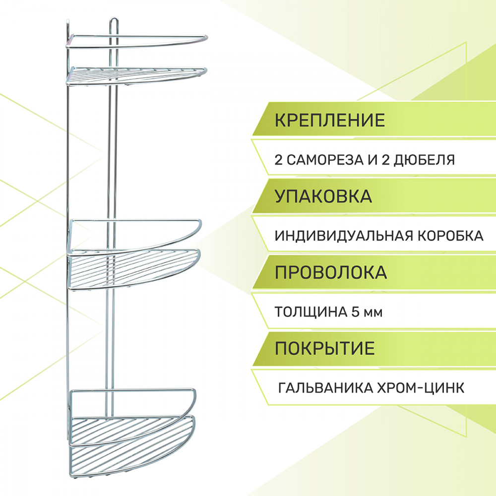 Полка трехъярусная угловая овальной формы — это практичное и долговечное решение для хранения банных принадлежностей. Изготовлена из стальной проволоки с гальваническим покрытием «блестящая оцинковка», обеспечивающим повышенную коррозионную стойкость. Толщина несущей конструкции составляет 5 мм, что гарантирует прочность и надёжность.