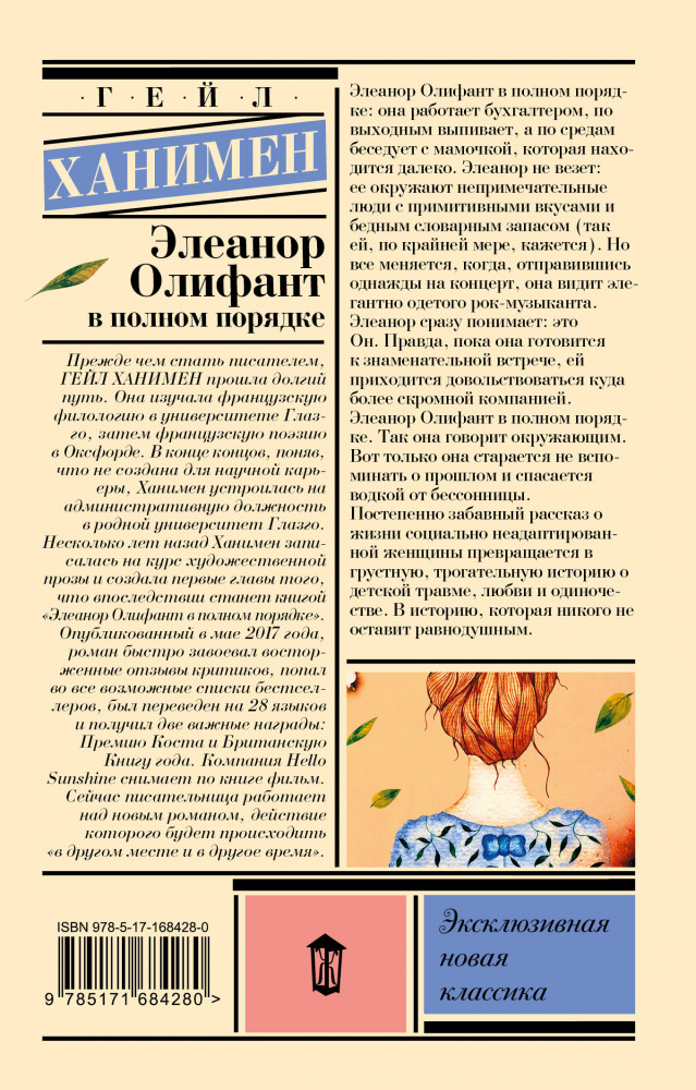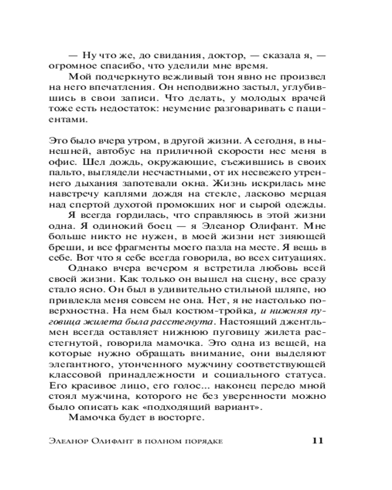 💳 Оплатить за товар можно при получении 🇰🇿 Есть бесплатная доставка по Казахстану от 1 дня 🎁 Копите бонусы с каждой покупки Серия: Эксклюзивная новая классика Элеанор Олифант в полном порядке: она работает бухгалтером, по выходным выпивает, а по средам беседует с мамочкой, которая находится далеко. Элеанор не везет: ее окружают непримечательные люди с примитивными вкусами и бедным словарным запасом (так ей, по крайней мере, кажется). Но все меняется, когда, отправившись однажды на концерт, она видит элегантно одетого рок-музыканта. Элеанор сразу понимает: это Он. Правда, пока она готовится к знаменательной встрече, ей приходится довольствоваться куда более скромной компанией. |