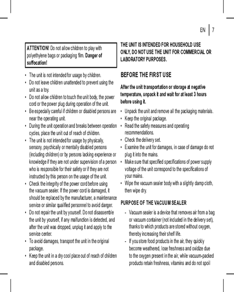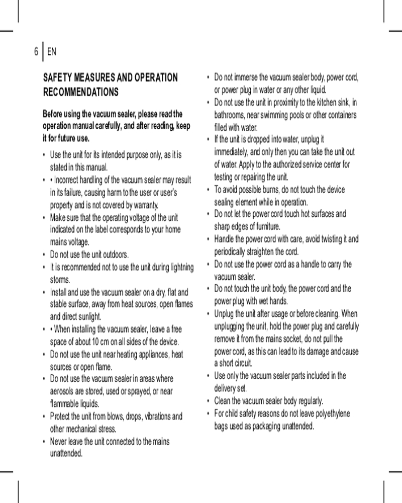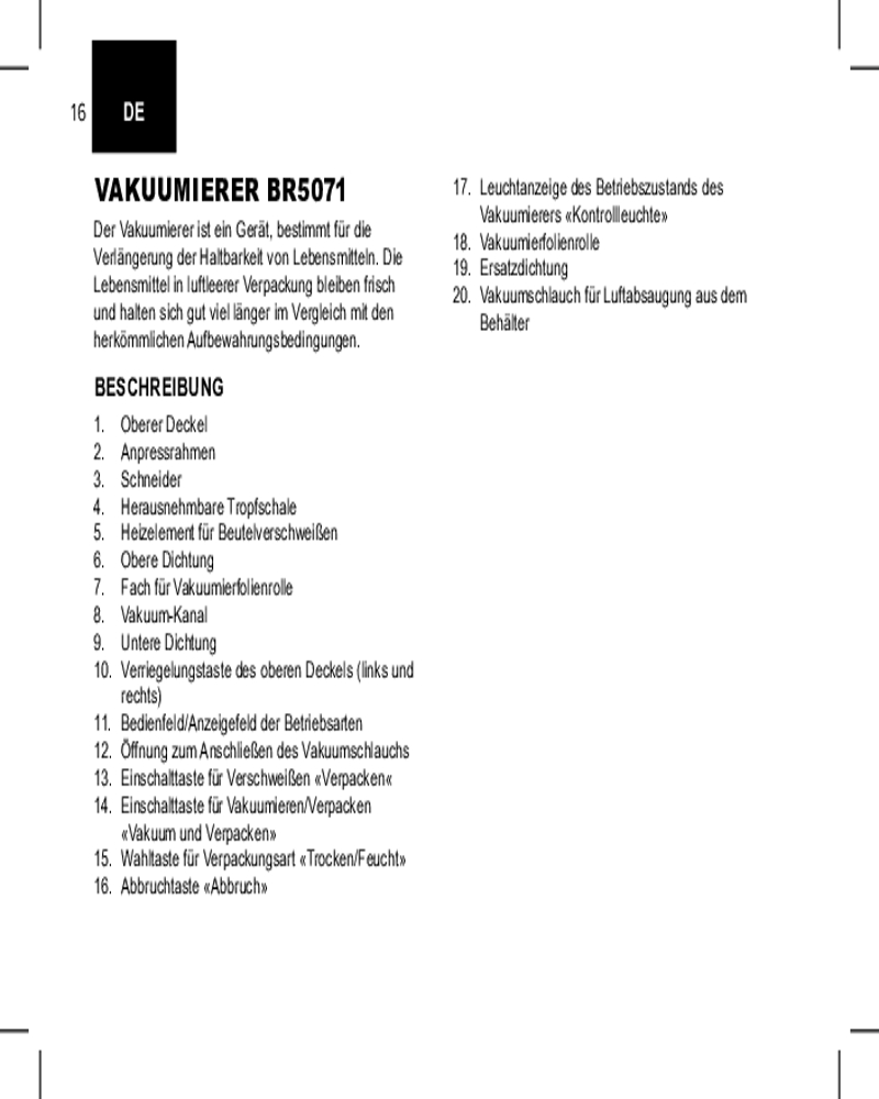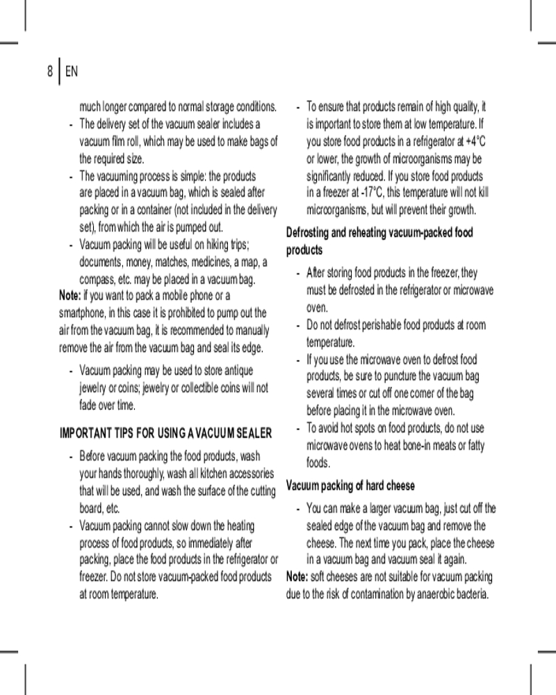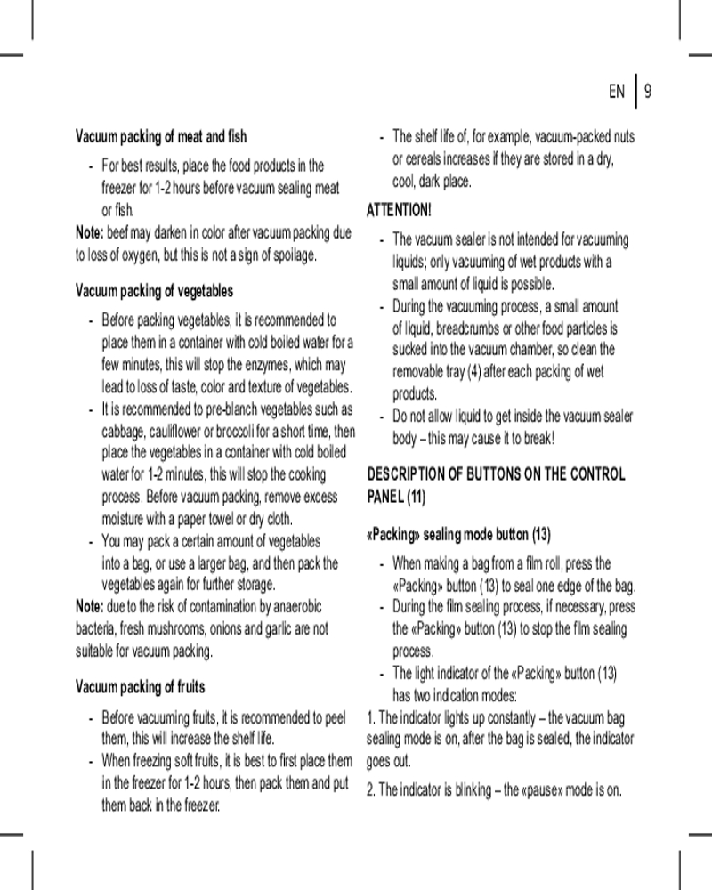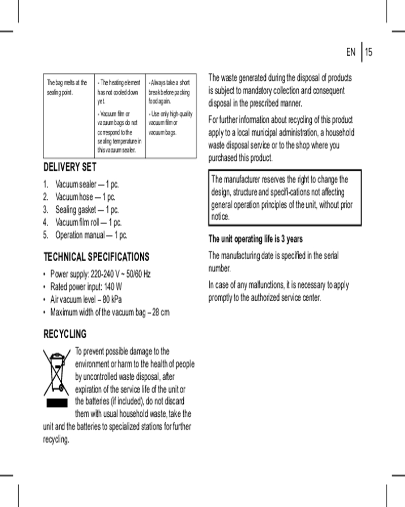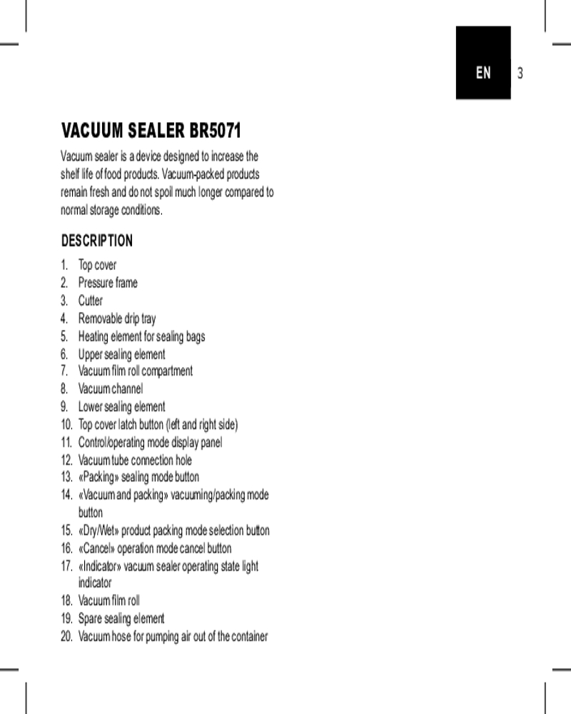 Электронное управление делает процесс вакуумирования интуитивно понятным, а специальные функции для вакуумирования продуктов в контейнерах и запайки пакетов позволяют использовать устройство по максимуму. Максимальная ширина пакета в 28 см дает возможность работать с различными размерами упаковки. Удобный отсек для хранения рулонов и встроенный нож для пленки добавляют функциональности, упрощая подготовку к работе. В комплекте идет рулон пленки, что делает покупку вакууматора BRAYER BR5071 еще более привлекательной. Устройство работает от электросети 220-240 В с частотой 50/60 Гц, что делает его универсальным решением для каждой кухни.