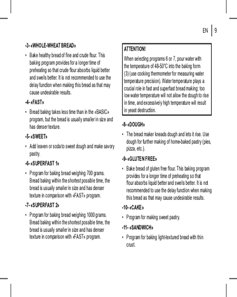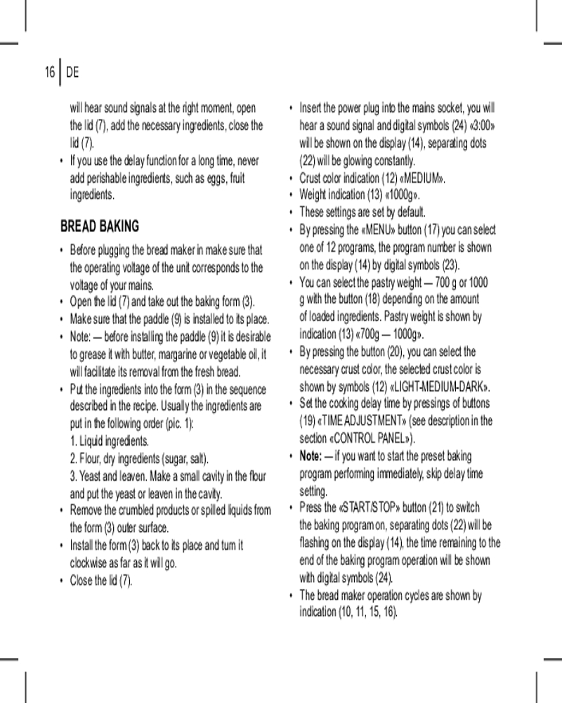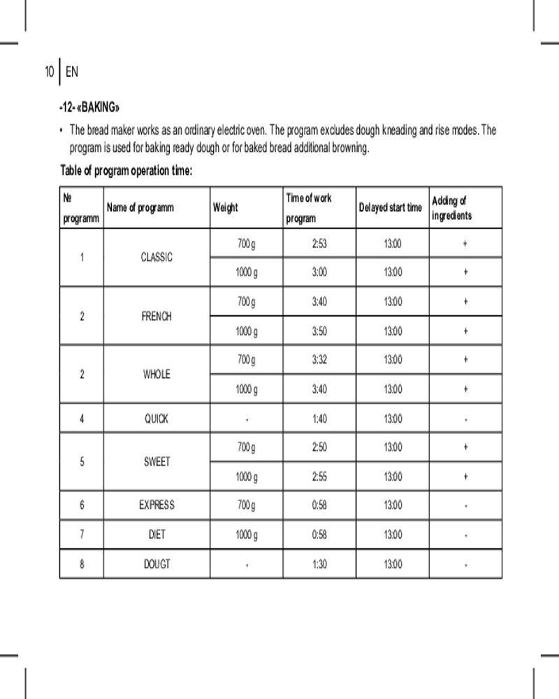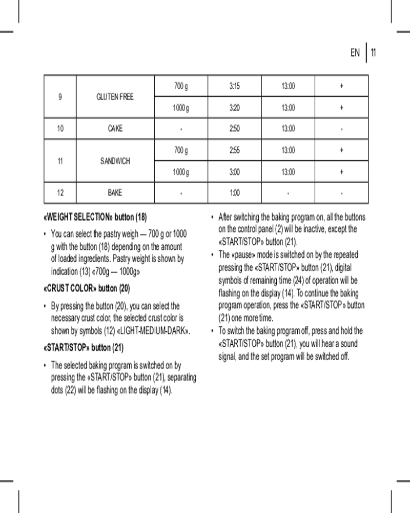 • отложенный старт. Функция отложенного старта позволяет приготовить выпечку к желаемому времени. Время, к которому приготовление должно завершиться, программируется с отсрочкой до 13 часов;