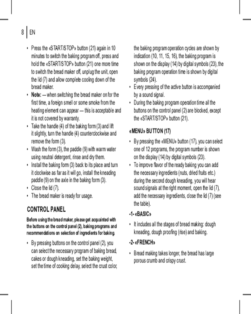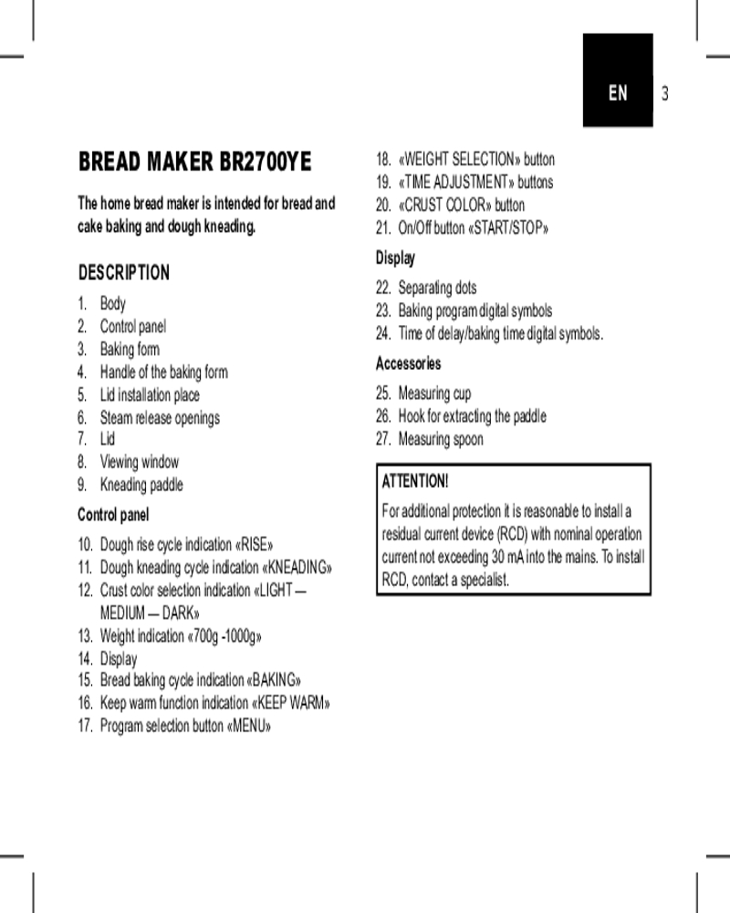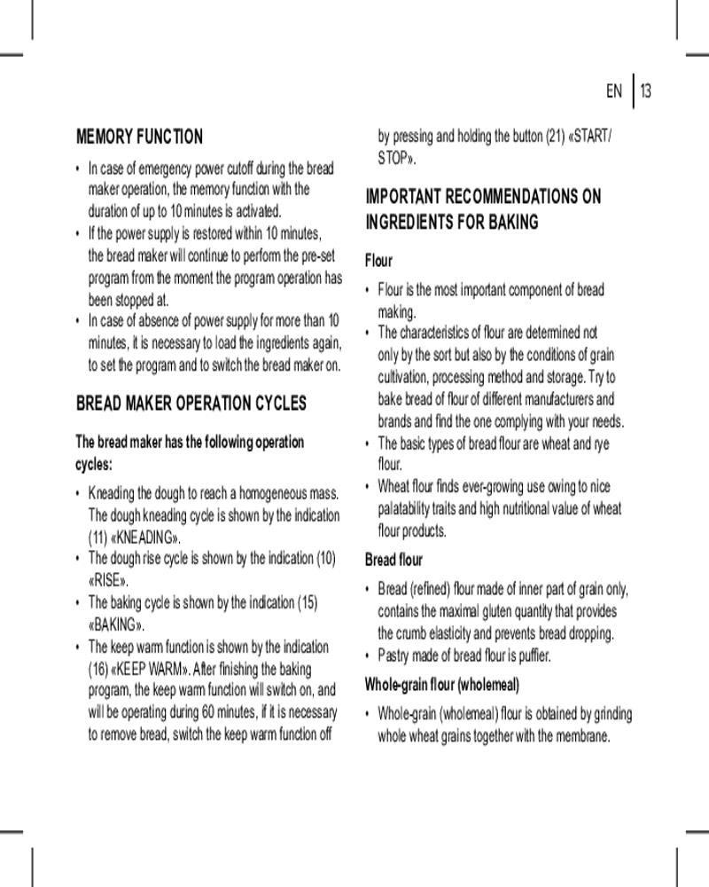 • удобство использования. Функция выбора цвета корочки (светлая, средняя или тёмная) даёт возможность удовлетворить даже самые изысканные предпочтения. Автозапуск программ при отсутствии электричества делает приготовление хлеба ещё более удобным, позволяя вам наслаждаться свежей выпечкой в любое время;