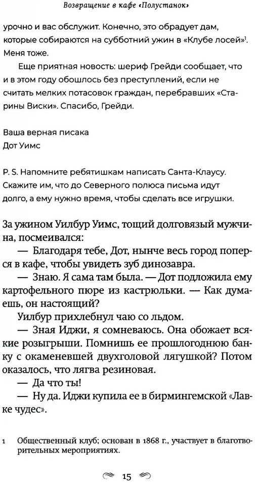 Во второй части писательница приглашает вернуться в городок Полустанок, который когда-то прославился своими жареными зелеными помидорами в станционном кафе. Трогательный роман о памяти, прошлом, о месте, куда влекут воспоминания, о волшебстве, которому всегда есть место в нашей жизни. Бадди Тредгуд вырос в Полустанке, с красавицей-матерью Руфью и любимой тетушкой, веселой хулиганкой Иджи. Руфь и Иджи держали кафе, которое обожали все жители Полустанка, да и не только Полустанка. Но время не знает жалости, городок захирел, жители его разъехались кто куда, все заросло бурьяном, дома стояли заколоченными. Печаль и тишина объяли некогда живой и веселый Полустанок, он превратился в город-призрак. Бадди давно уже не только вырос, но и состарился. И все сильнее в нем становилось желание вернуться в счастливое прошлое, еще хотя бы разок пройтись по местам детства, побывать в Полустанке, заглянуть в кафе... И однажды он решается на бегство туда, где он был так счастлив, где жили лучшие люди на земле. В этом ностальгическом приключении к нему присоединятся и другие герои Фэнни Флэгг, милые, смешные, обаятельные и такие родные. |