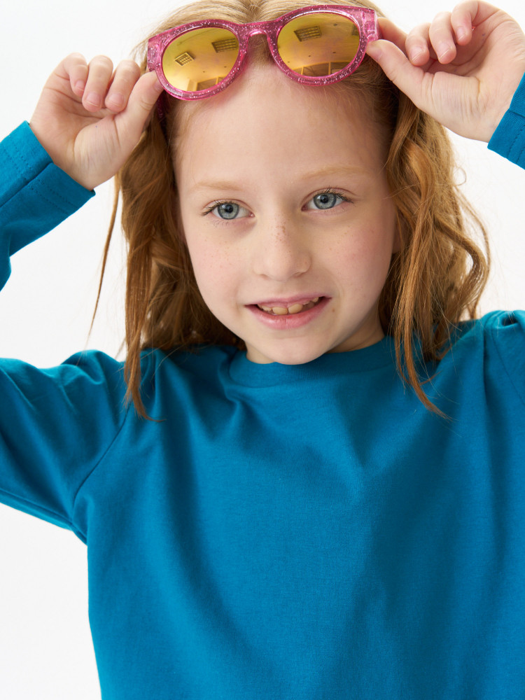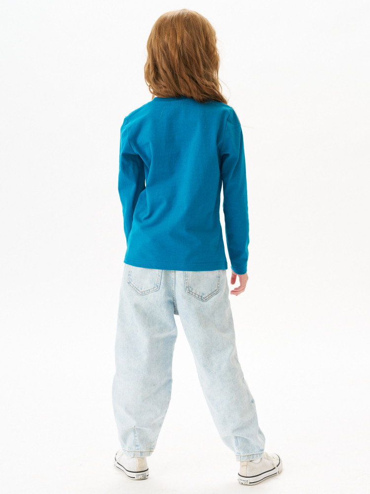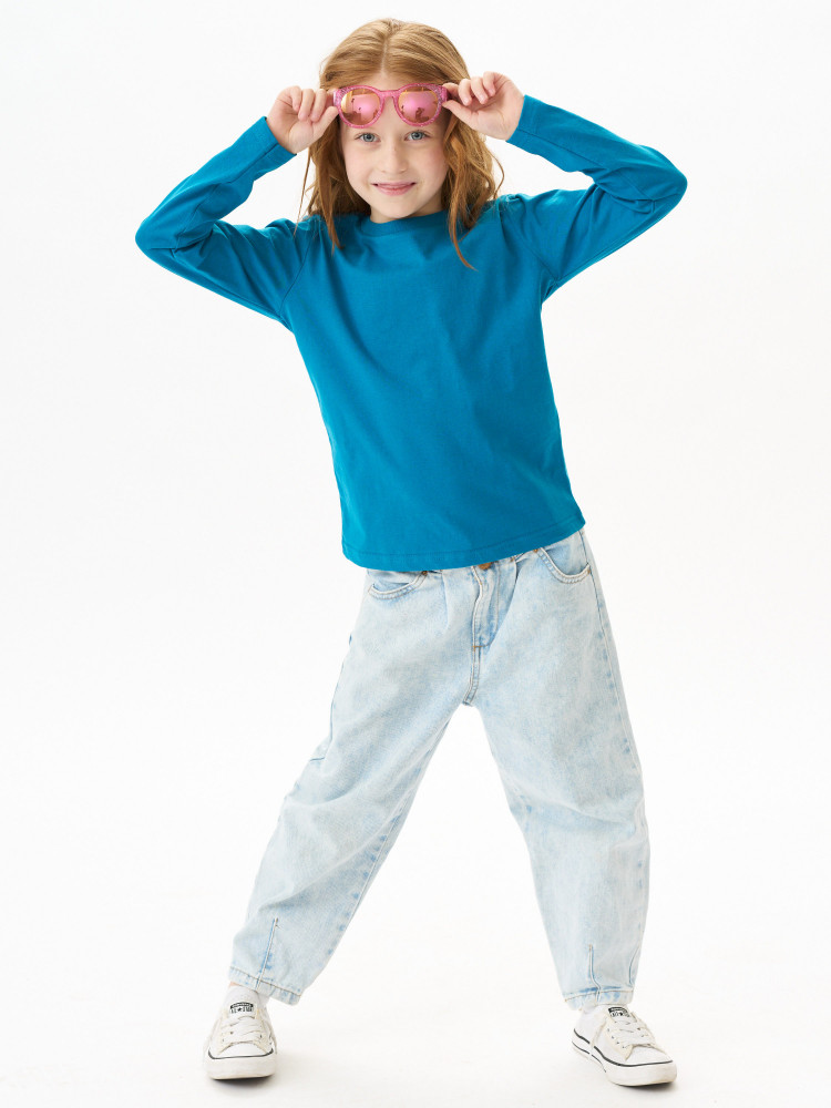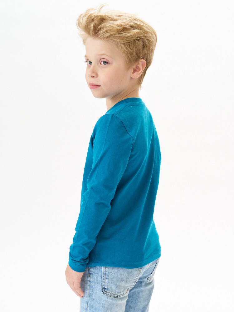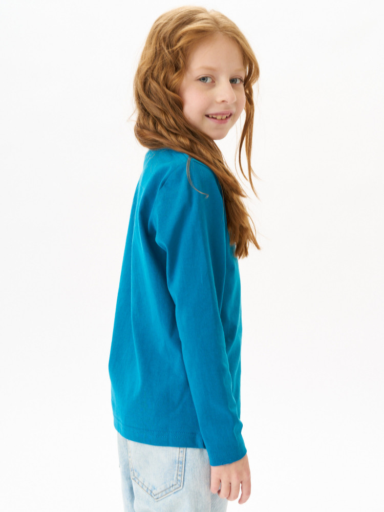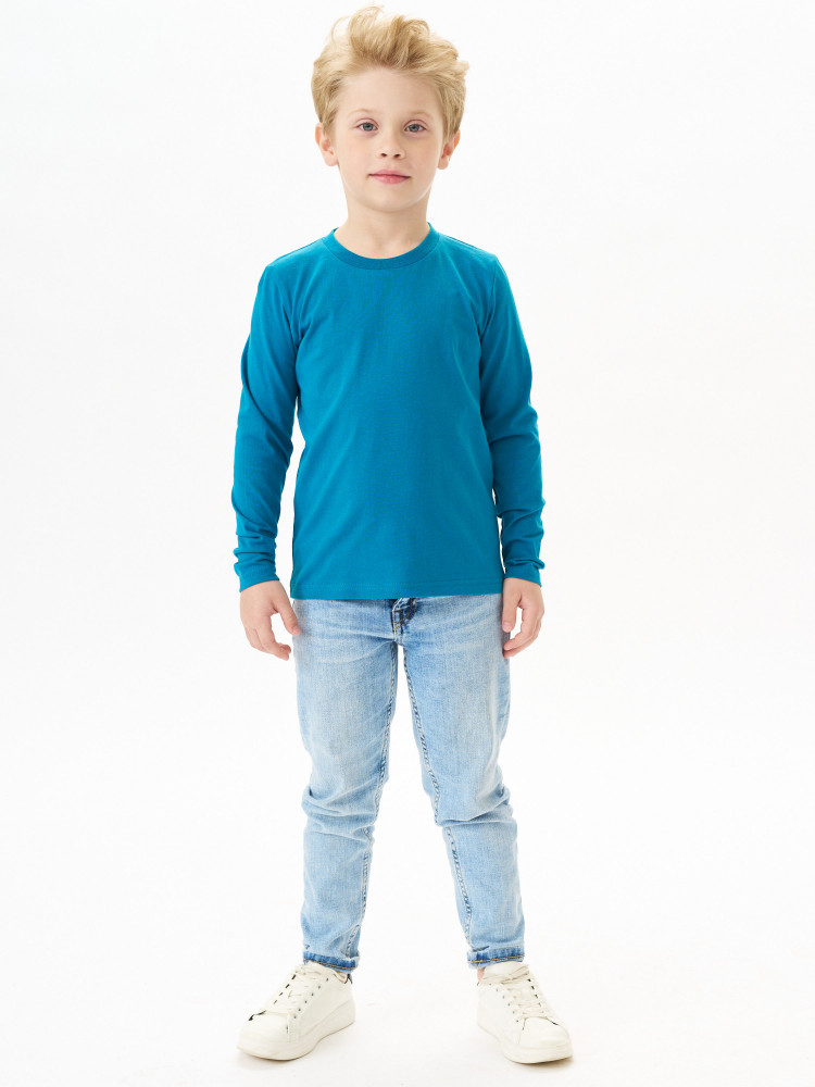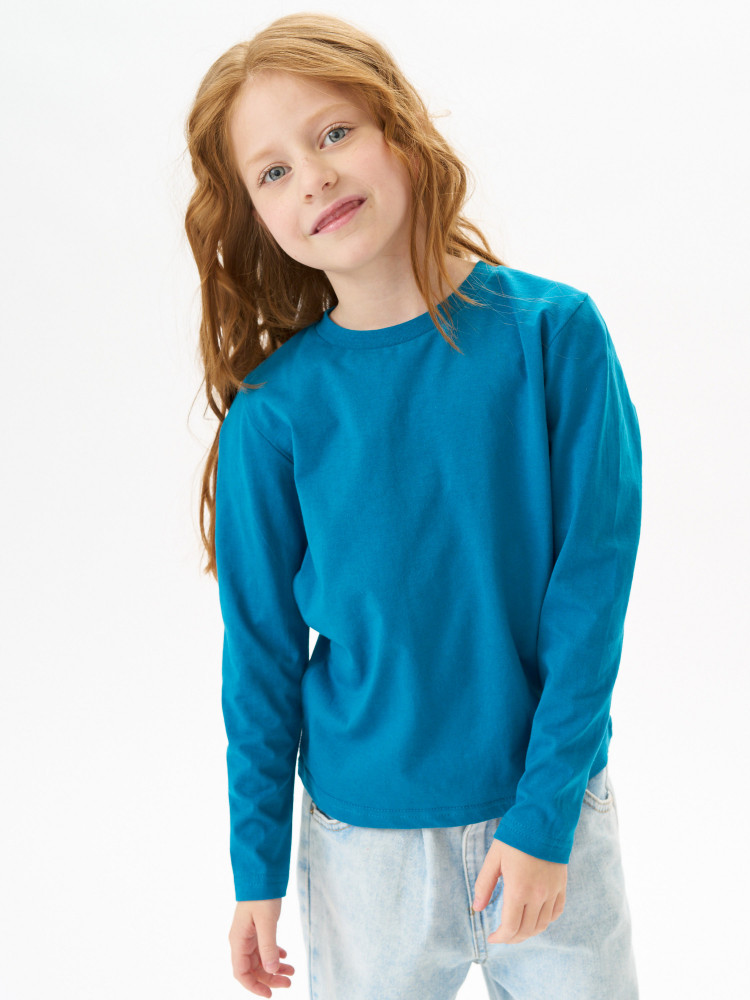 Лонгслив детский прямого покроя с втачным длинным рукавом. По линии горловины втачен ворот из ластичного полотна с 5% добавлением лайкры. Перед и спинка цельнокроеная. Плечевые швы обтачены бейкой из основного полотна, в край проложена отделочная строчка. Низ и рукава подогнуты и подшиты на распошивальной машине. Состав — 100% органический длинноволокнистый хлопок. Ткань — кулирная гладь, из гребенной пряжи Ne 24/1, активное глубокое крашение.
