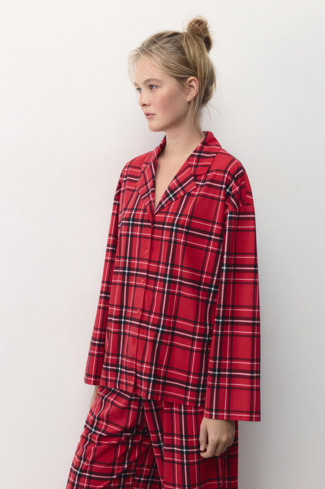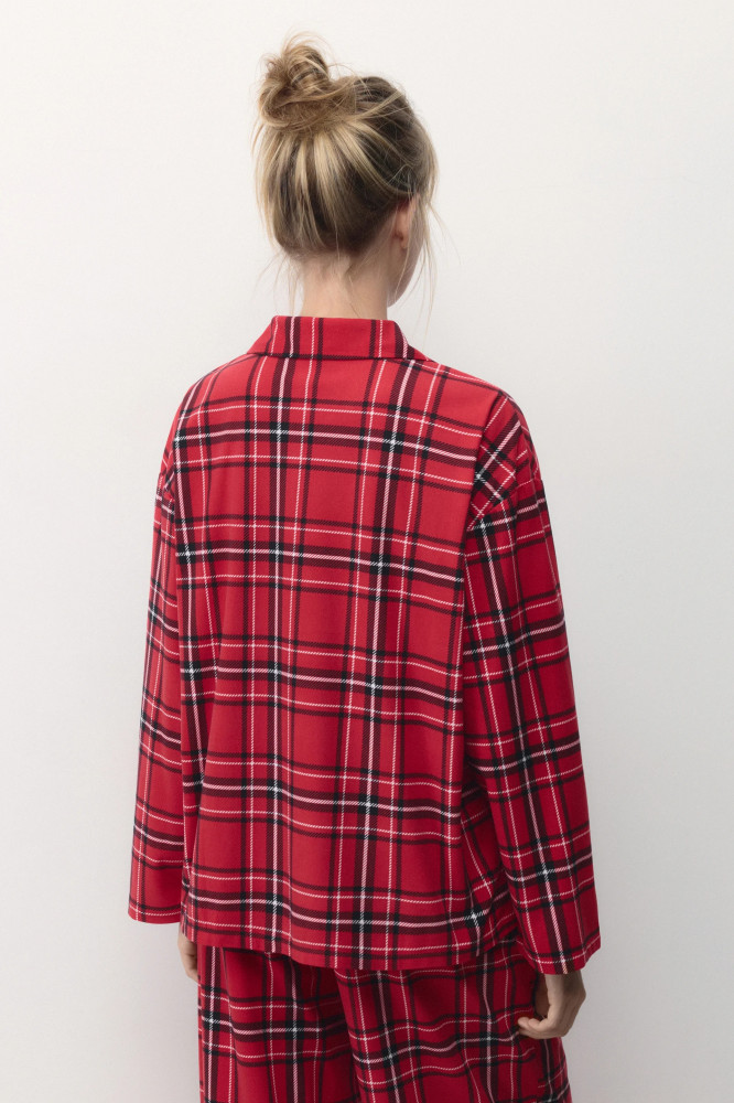Женская пижамная рубашка свободного кроя из мягкой и очень приятной к телу ткани с фланелевой фактурой. Отложной рубашечный воротник с лацканами и V-образный вырез на груди. Застежка на мелкие пуговицы спереди. Длинные свободные рукава с прямыми манжетами и спущенной линией плеча. Прямой нижний край без разрезов. Суперудобная, мягкая домашняя блузка в клетку, которая подарит тебе самые уютные и комфортные вечера наедине с собой любимой. Сочетай ее с удобными широкими брюками из комплекта или со своими любимыми домашними брюками, шортами или леггинсами и наслаждайся теплом и уютом своего дома. Легкая, дышащая модель с мягкими швами подойдет как для сна, так и для активного домашнего времяпровождения.