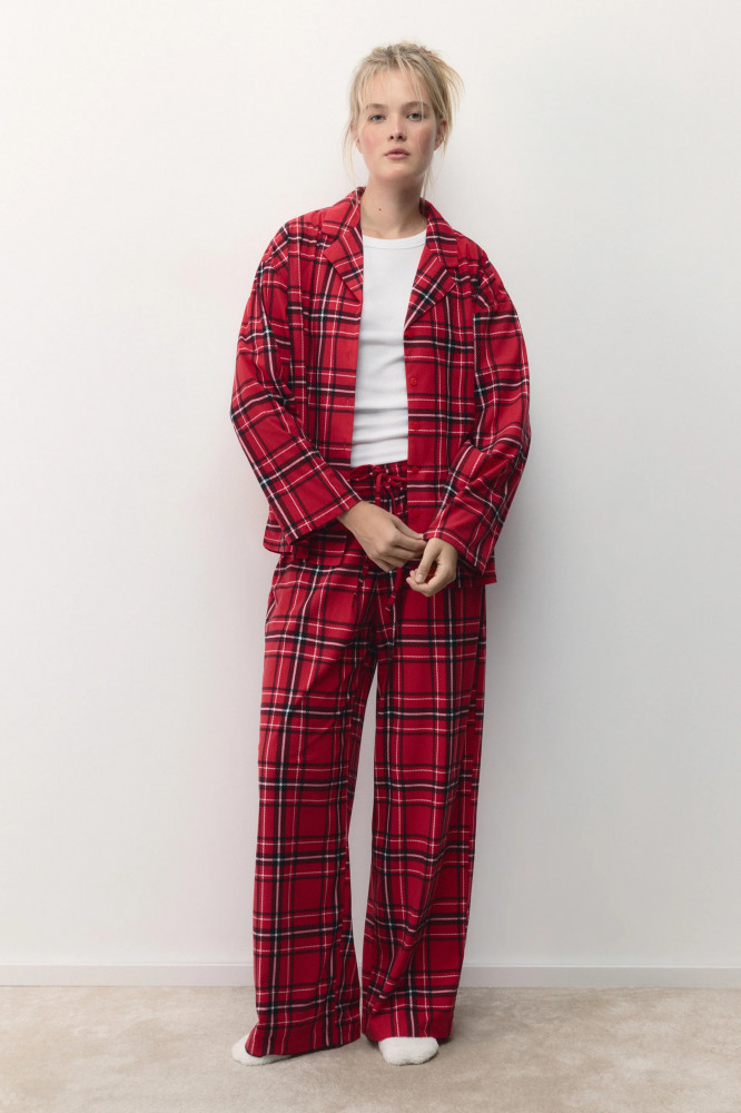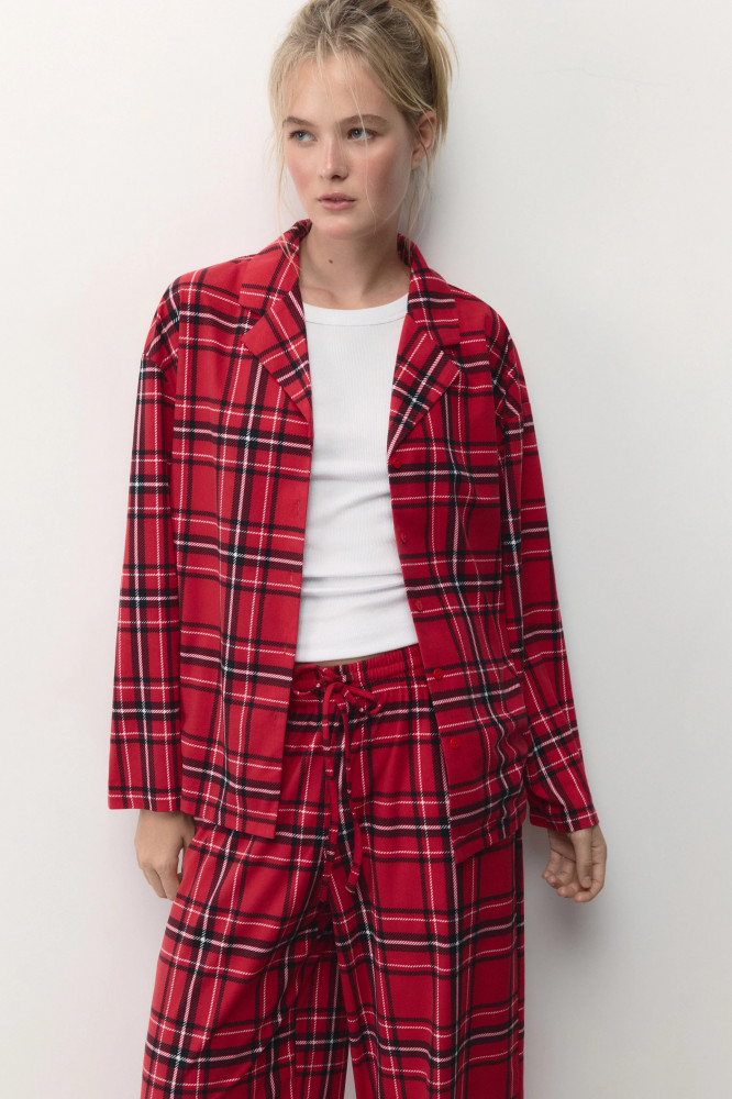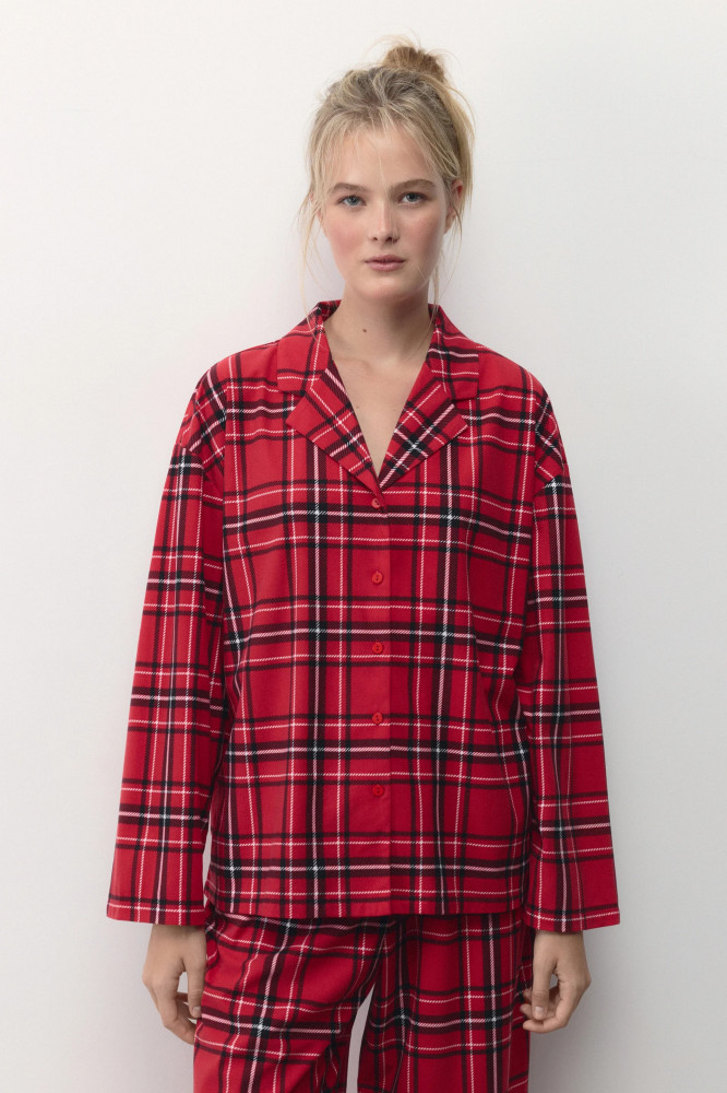 Женская пижамная рубашка свободного кроя из мягкой и очень приятной к телу ткани с фланелевой фактурой. Отложной рубашечный воротник с лацканами и V-образный вырез на груди. Застежка на мелкие пуговицы спереди. Длинные свободные рукава с прямыми манжетами и спущенной линией плеча. Прямой нижний край без разрезов. Суперудобная, мягкая домашняя блузка в клетку, которая подарит тебе самые уютные и комфортные вечера наедине с собой любимой. Сочетай ее с удобными широкими брюками из комплекта или со своими любимыми домашними брюками, шортами или леггинсами и наслаждайся теплом и уютом своего дома. Легкая, дышащая модель с мягкими швами подойдет как для сна, так и для активного домашнего времяпровождения.
