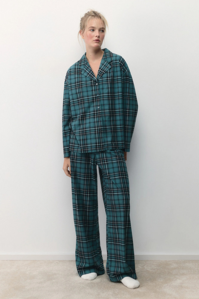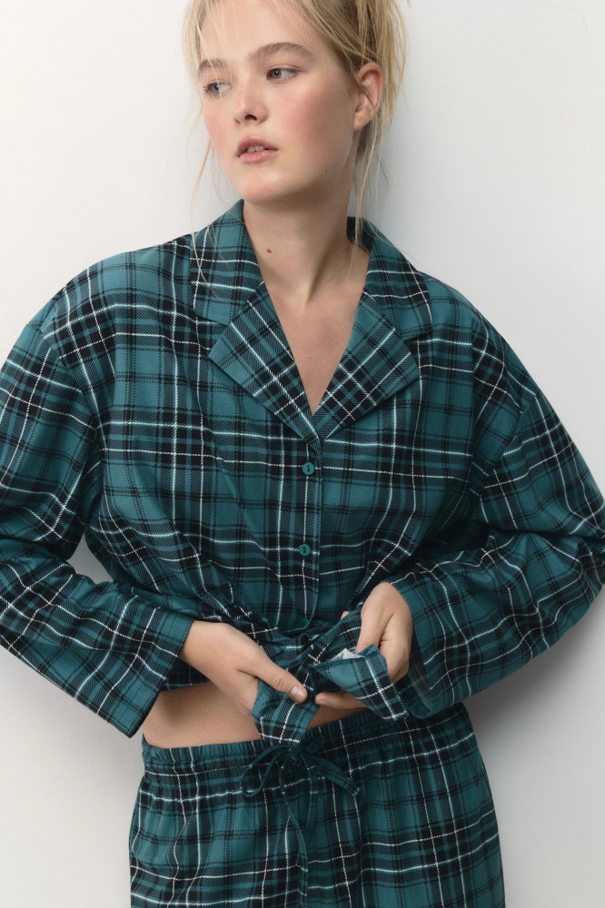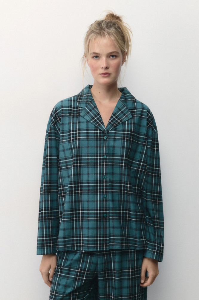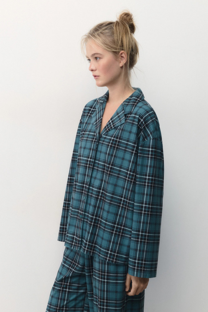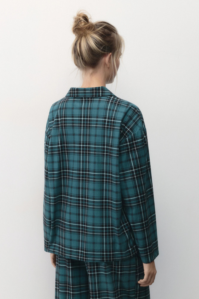 Женская пижамная рубашка свободного кроя из мягкой и очень приятной к телу ткани с фланелевой фактурой. Отложной рубашечный воротник с лацканами и V-образный вырез на груди. Застежка на мелкие пуговицы спереди. Длинные свободные рукава с прямыми манжетами и спущенной линией плеча. Прямой нижний край без разрезов. Суперудобная, мягкая домашняя блузка в клетку, которая подарит тебе самые уютные и комфортные вечера наедине с собой любимой. Сочетай ее с удобными широкими брюками из комплекта или со своими любимыми домашними брюками, шортами или леггинсами и наслаждайся теплом и уютом своего дома. Легкая, дышащая модель с мягкими швами подойдет как для сна, так и для активного домашнего времяпровождения.