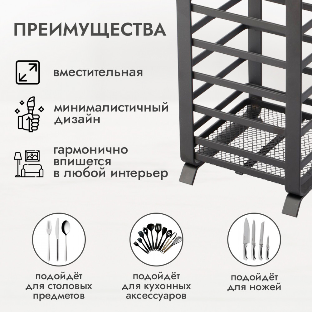 Супер стильная и удобная подставка! Достаточно большая и высокая - поместились все часто используемые кухонные аксессуары и их удобно доставать. Также достаточно широкая, стоит уверенно, не падает. Дно из сеточки, можно даже мокрое складывать.