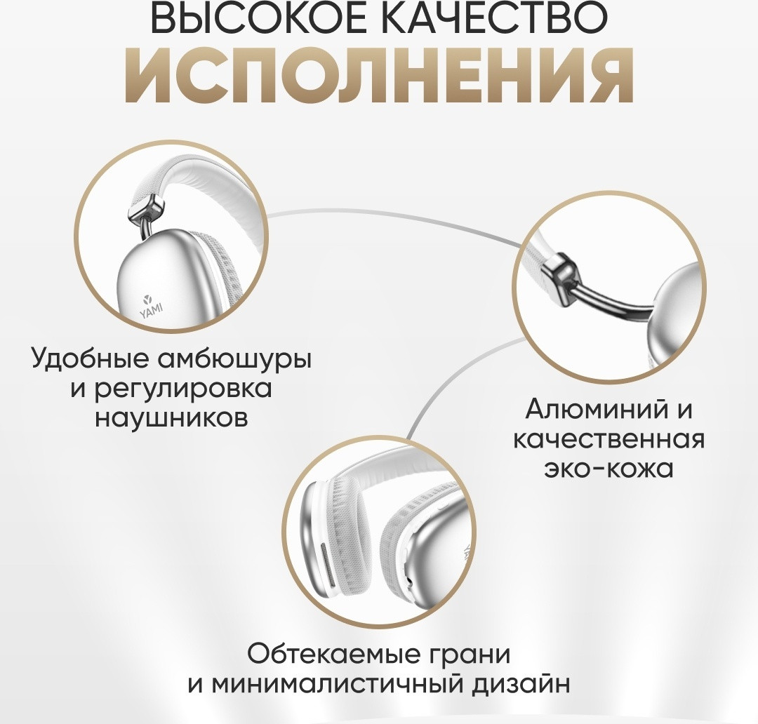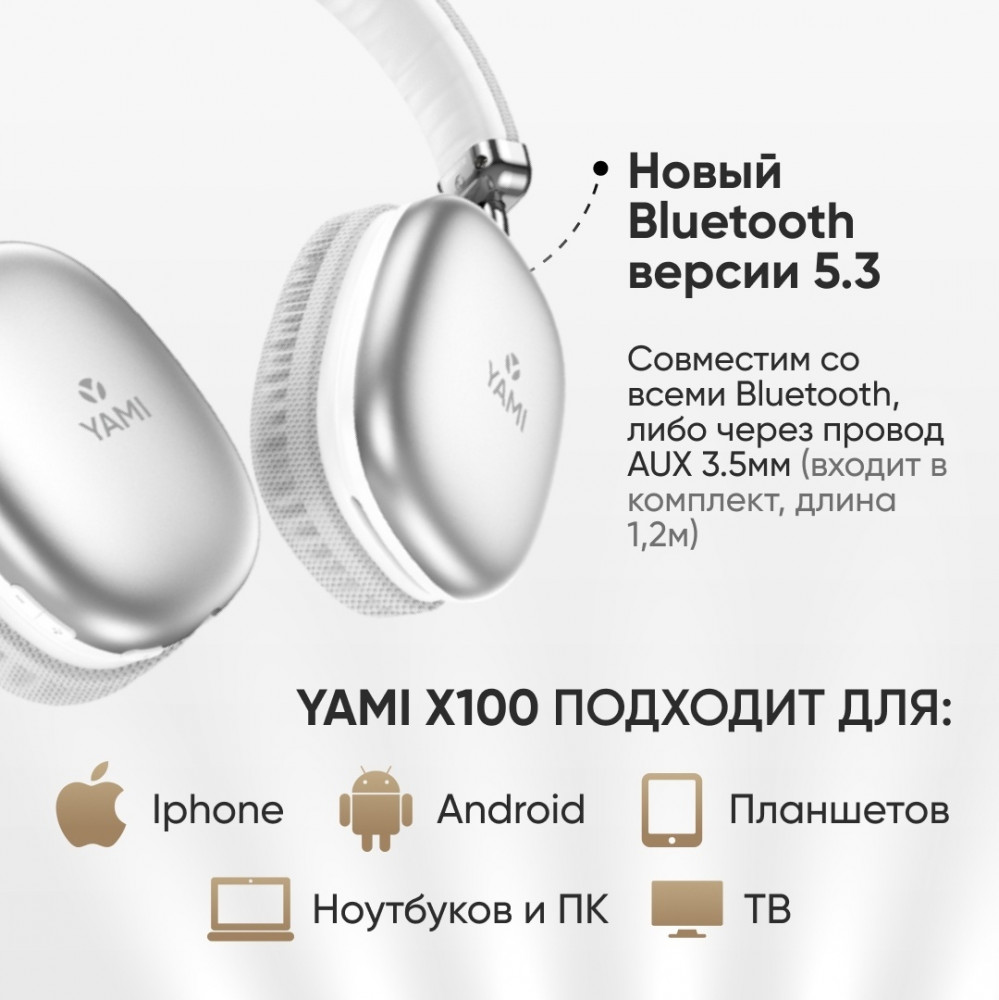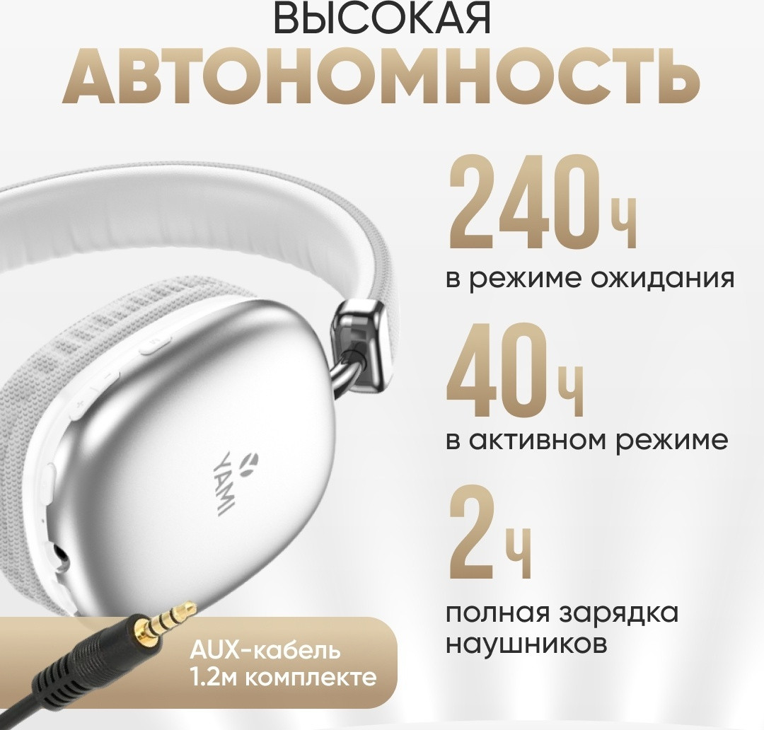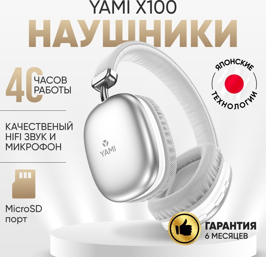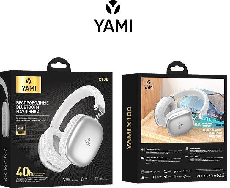 Беспроводные накладные наушники Yami X100. Имеют отличный объемный звук и встроенный микрофон. Воспроизведение музыки и аудиозаписей возможно как с флеш карты MicroSD, так и при подключении к смартфону через Bluetooth или AUX. Наушники обладают отличной автономностью: до 240 часов в режиме ожидания, полная зарядка за 2 часа, работа в активном режиме — до 40 часов.