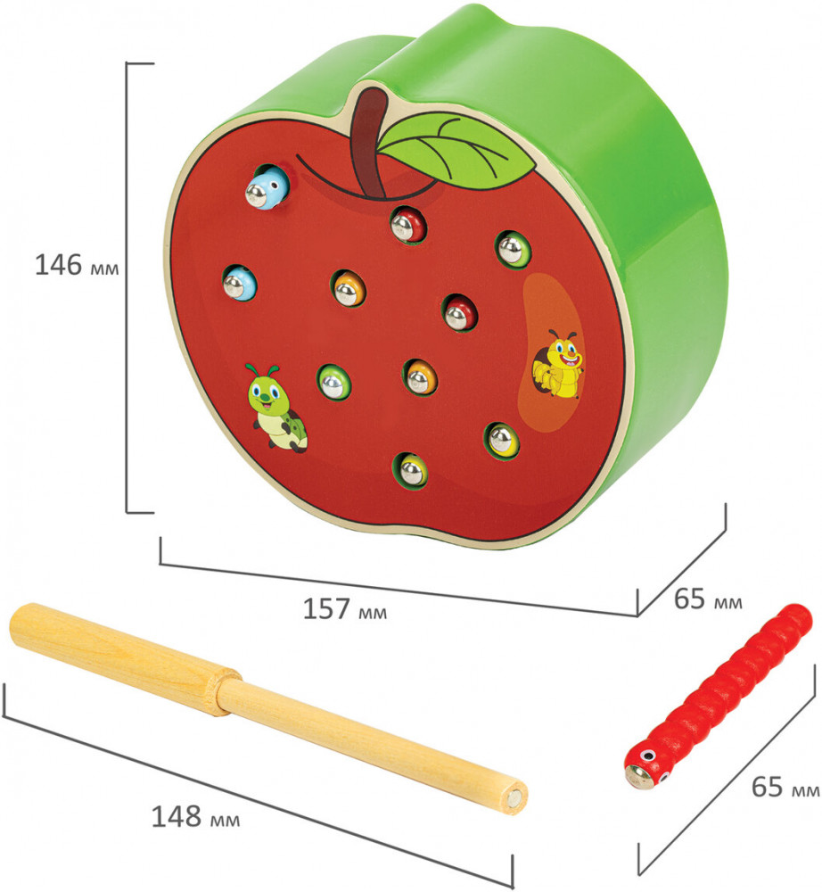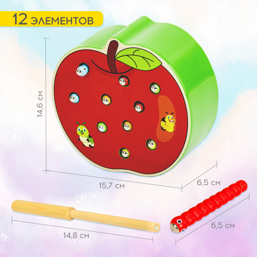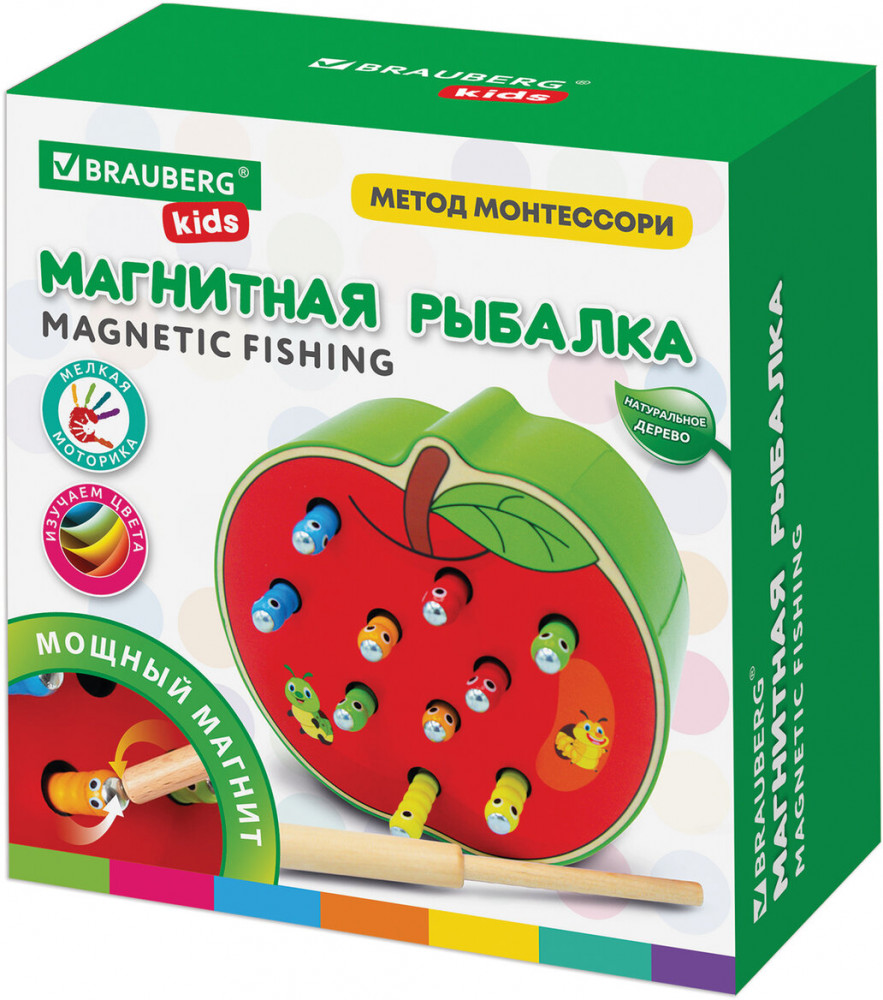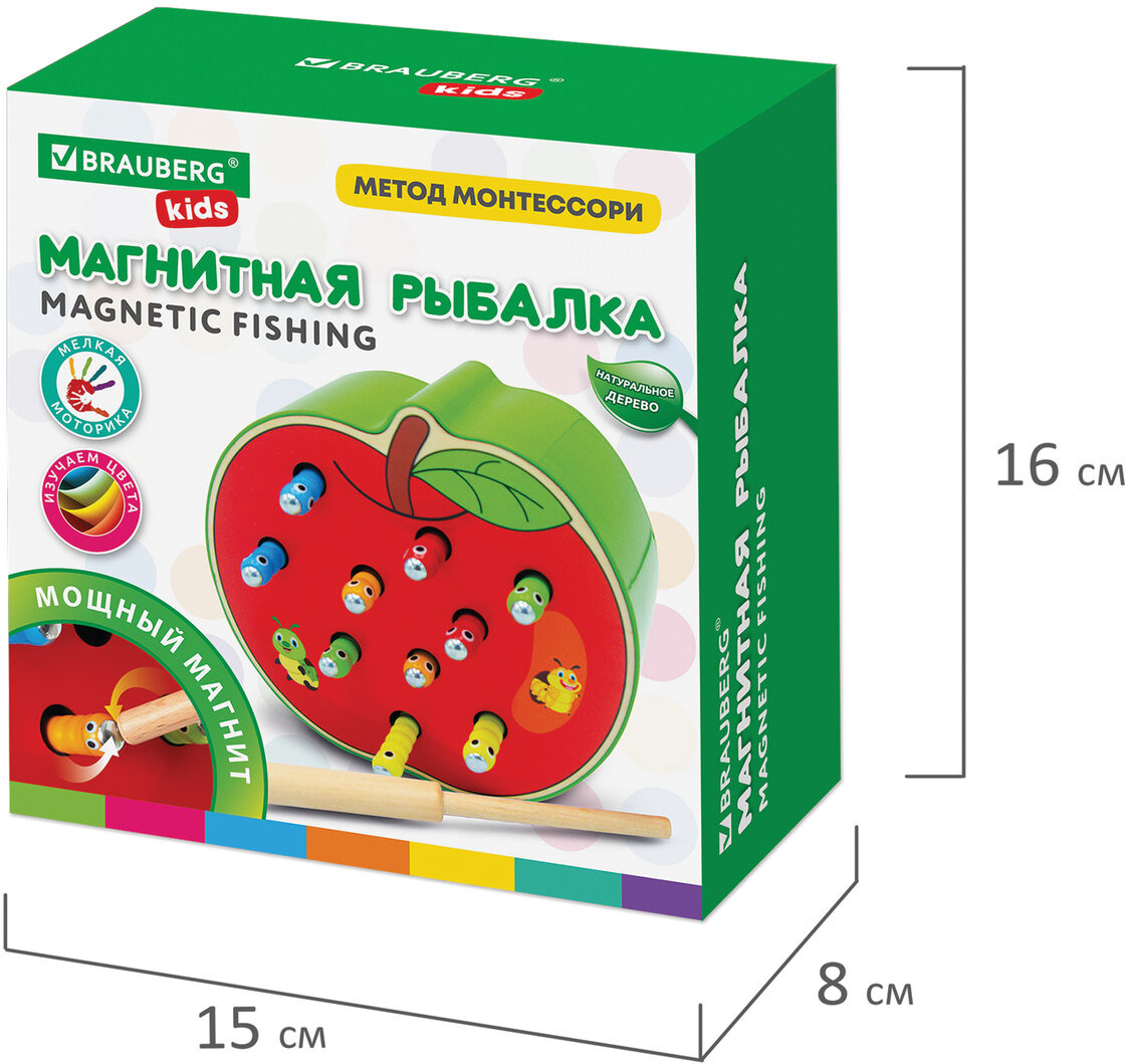 Уникальная развивающая и обучающая игрушка магнитная рыбалка Brauberg Kids поможет малышу развить координацию движений, логику и мышление. Яркое яблочко обязательно привлечет внимание ребенка и займет его надолго. Игра заключается в том, чтобы магнитной палочкой доставать червячков из основы. После этого малыш может рассортировать их обратно по лункам, развивая при этом аккуратность и навык вложения. С помощью гусениц ребенок будет изучать основные цвета и счет до десяти.