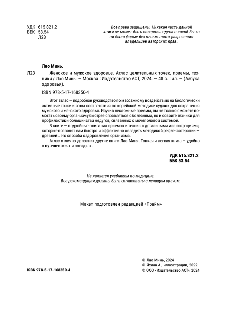 💳 Оплатить за товар можно при получении 🇰🇿 Есть бесплатная доставка по Казахстану от 1 дня 🎁 Копите бонусы с каждой покупки Серия: Азбука здоровья Восточная медицина — древняя наука сохранения здоровья и поддержания гармонии всех систем организма через воздействие на биологически активные точки. Этот атлас — подробное руководство по массажному воздействию на биологически активные точки и зоны соответствия по корейской методике суджок для сохранения мужского и женского здоровья. Благодаря описанным здесь приемам, основанным на корейской методике суджок, вы научитесь регулировать работу вашего организма. Вы сможете освоить техники оздоровления и профилактики разнообразных недугов, связанных с мочеполовой системой. В книге — подробные описания массажных приемов с детальными иллюстрациями, которые позволят вам быстро и эффективно овладеть методикой рефлексотерапии. Массажное воздействие на биологически активные точки можно применять как для себя, так и для оздоровления близких. |