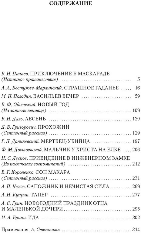 В сборнике публикуются рассказы и повести русских писателей XIX–XX вв. — А. А. Бестужева-Марлинского, В. И. Даля, Д. В. Григоровича, А. П. Чехова, И. А. Бунина и др., объединенные темой Святок. Н. С. Лесков дал одно из самых известных определений святочного рассказа: от него «непременно требуется, чтобы он был приурочен к событиям святочного вечера — от Рождества до Крещенья, чтобы он был сколько-нибудь фантастичен, имел какую-нибудь мораль, хоть вроде опровержения вредного предрассудка, и наконец — чтобы он оканчивался непременно весело... Он должен быть истинное происшествие!» И вместе с тем «пестрота» сюжетной и философской наполненности святочных рассказов свидетельствует об отсутствии каких-либо строгих канонов: произведения, включенные в это издание, демонстрируют разнообразие авторских подходов к святочной тематике. |