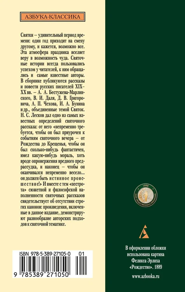 В данный момент этот товар отсутствует в продаже. Возможно, у нас найдется аналогичный или похожий товар здесь. Серия: Азбука-классика (pocket-book) Святки — удивительный период времени: один год приходит на смену другому, и кажется, что все горести останутся в прошлом, а будущее, которое приоткрывает свои тайны, будет наполнено добром и справедливостью. Эта атмосфера праздника вселяет веру в возможность чуда. Святочные истории всегда пользовались успехом у читателей, к ним обращались многие известные авторы.