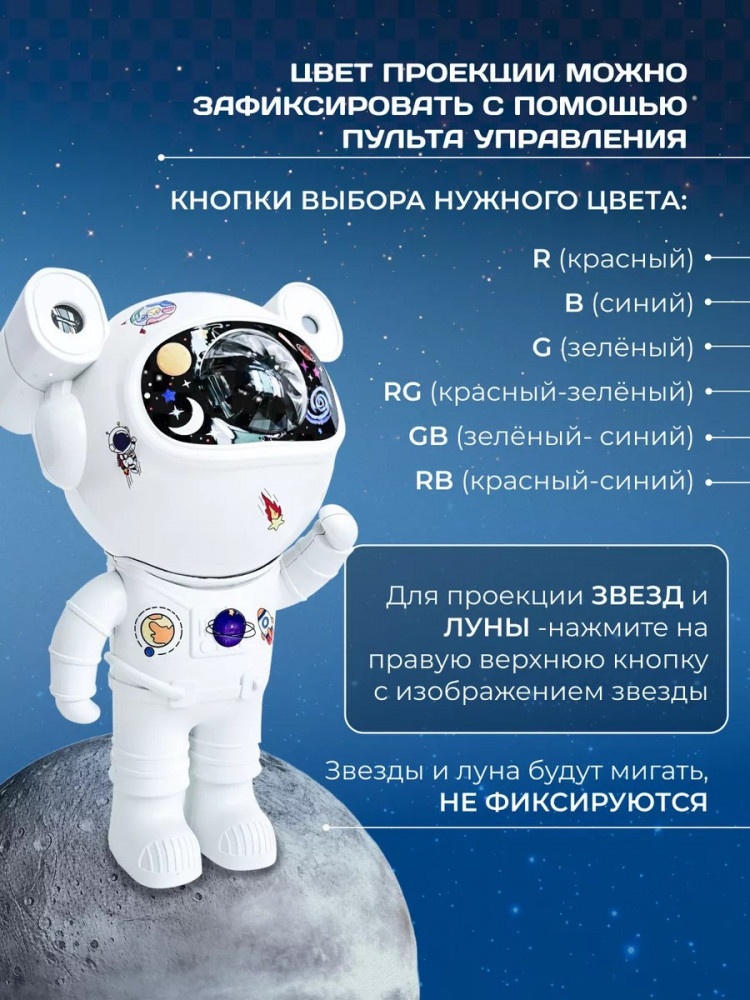 В данный момент этот товар отсутствует в продаже. Возможно, у нас найдется аналогичный или похожий товар здесь. Погрузитесь в мир звездного неба с уникальным проектором в форме космонавта. Этот стильный и функциональный гаджет станет идеальным дополнением для создания романтической атмосферы в вашем доме или уютного уголка для отдыха. Проектор выполнен из качественного ABS и PC, что обеспечивает его долговечность и надежность.
