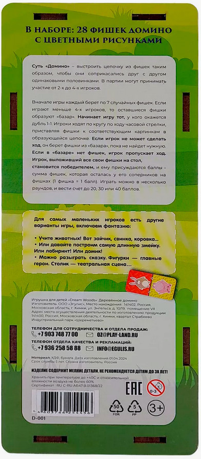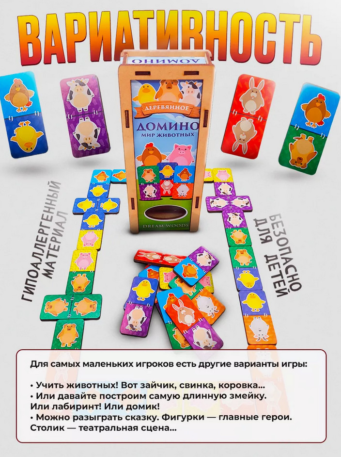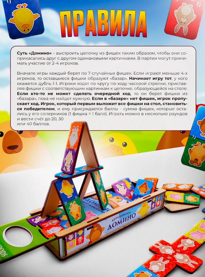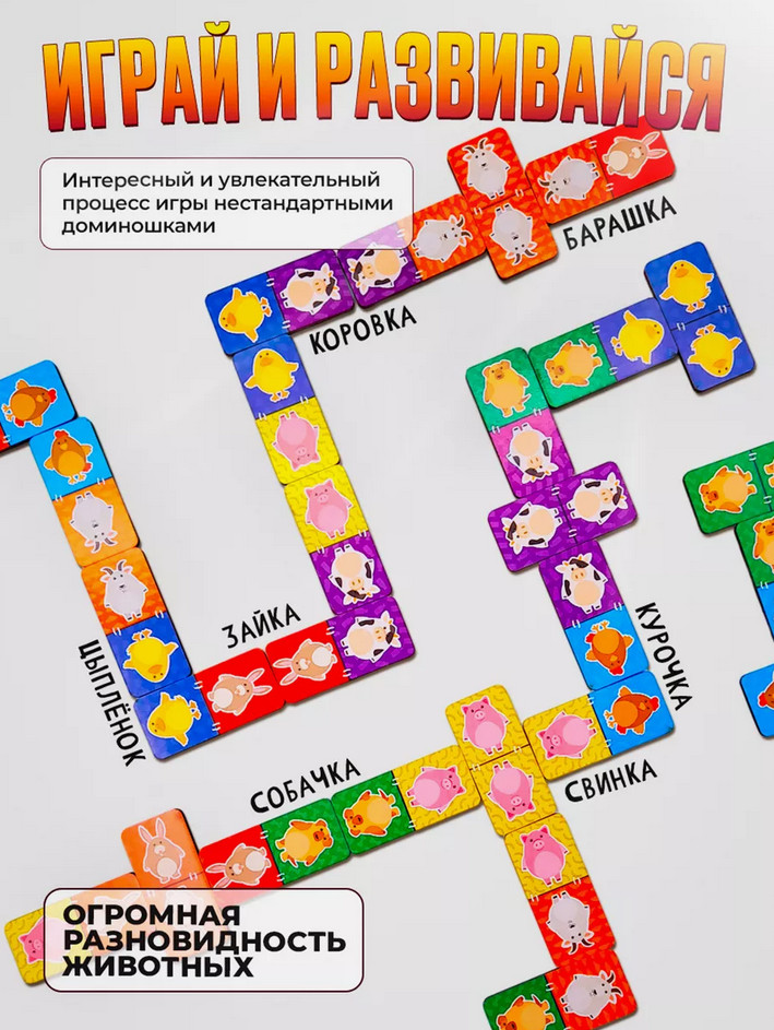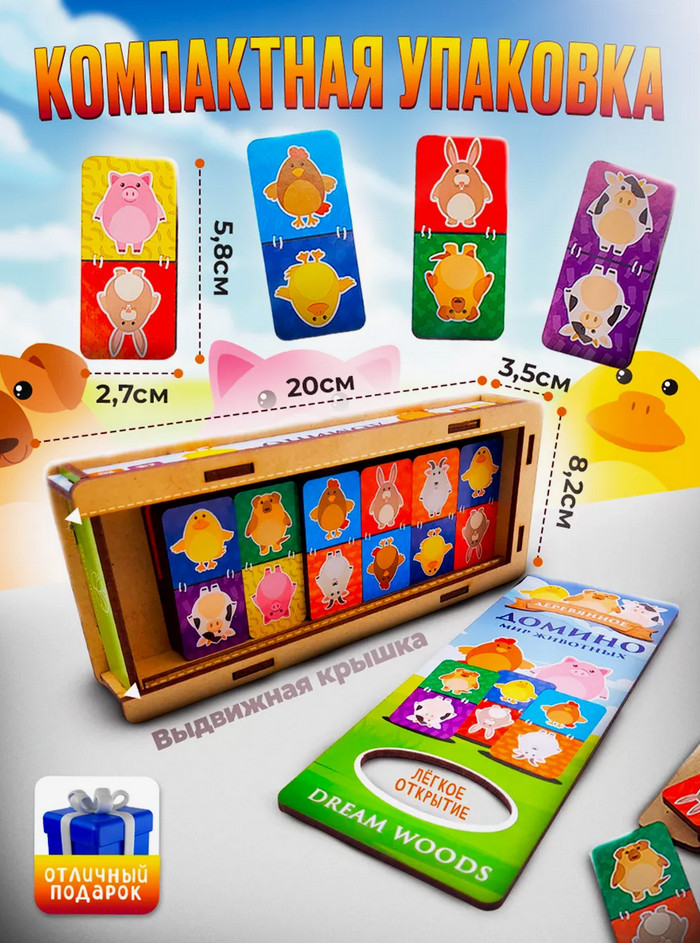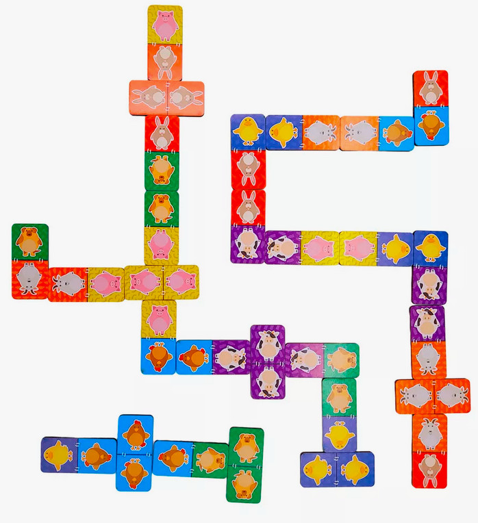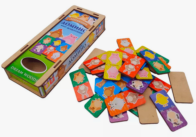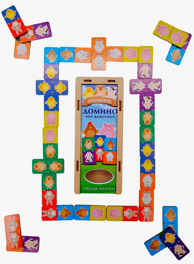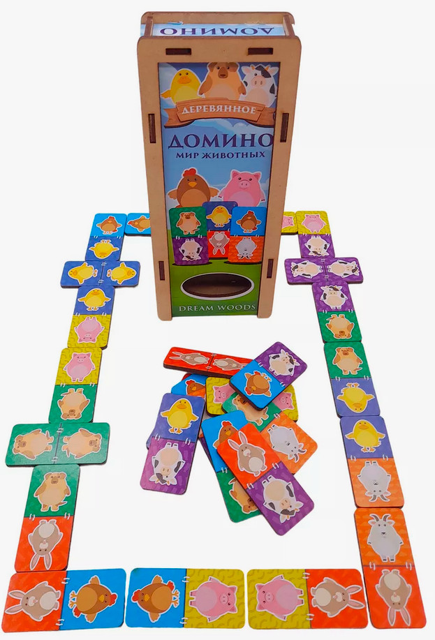 Dream Woods Домино «Животные»В данный момент этот товар отсутствует в продаже. Возможно, у нас найдется аналогичный или похожий товар здесь. Настольная игра позволит весело и интересно провести досуг с друзьями и в кругу семьи. Игра состоит из карточек. На лицевую сторону нанесено изображение. Играя в домино, ребенок познакомится с животными, будет тренировать логику и мышление. Каждый игрок должен добавить в цепочку из фишек одну их своих фишек так, чтобы изображение на ней подошло к изображению на конце цепи. Если в руках у игрока нет подходящей фишки, он берет дополнительные до тех пор, пока не попадется нужная. Выигрывает тот, кто первым выложит все свои фишки. |