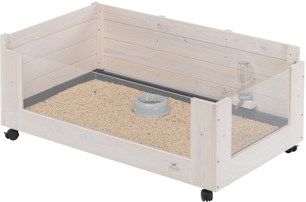 Современный дизайн с прозрачными пластиковыми стенками обеспечивает полный обзор животного, облегчая ежедневное наблюдение. Верхняя часть полностью открыта, что обеспечивает легкий доступ для общения с питомцем и выполнения задач по уходу и уборке. Дерево защищено нетоксичной краской на водной основе, что гарантирует безопасность и благополучие животного и продлевает срок службы изделия. Кроме того, сняв прозрачную переднюю часть, можно установить практичную лесенку, позволяющую морской свинке свободно входить и выходить, с любопытством изучая окружающее пространство.
