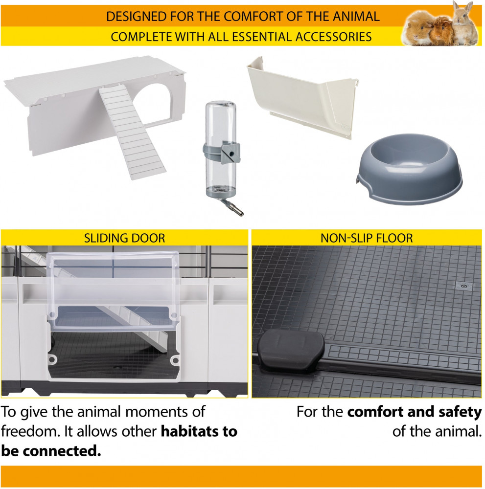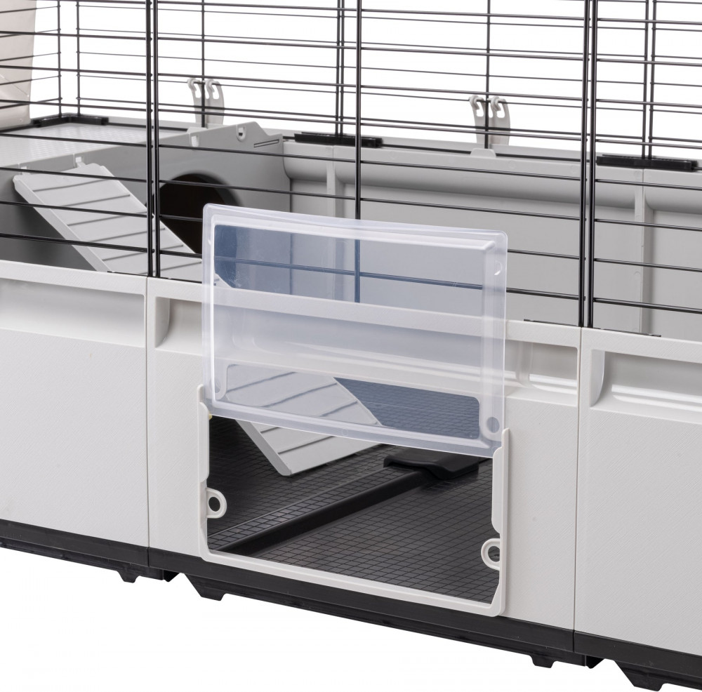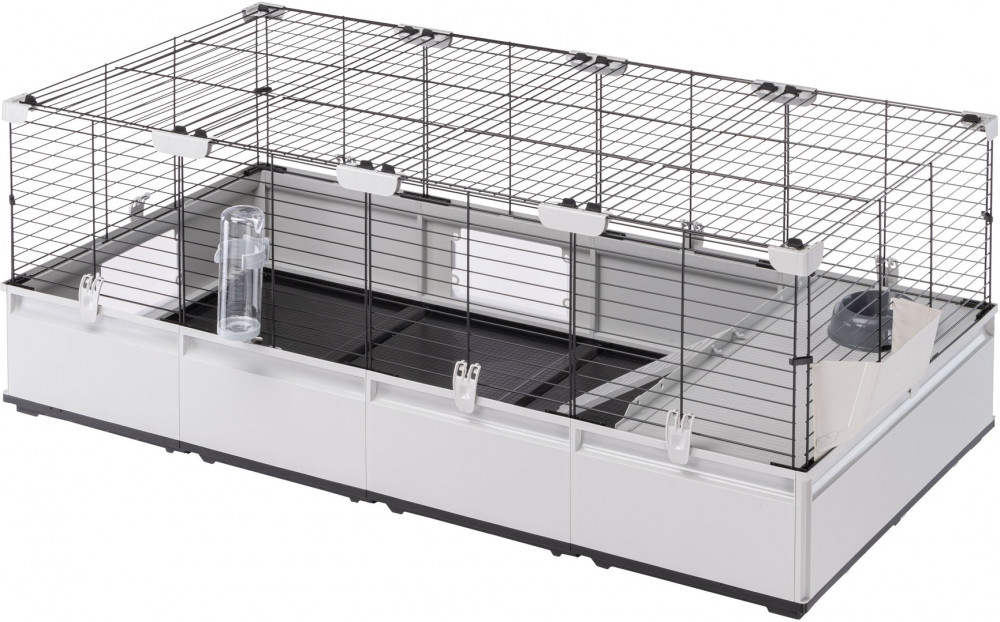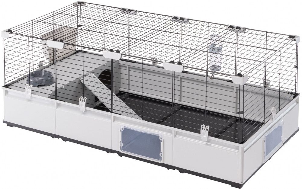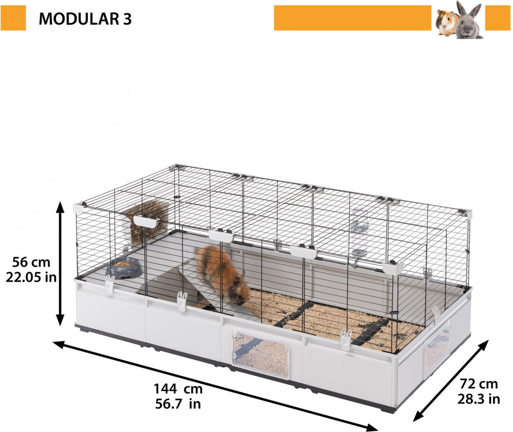Жилая площадь модели Modular 3 составляет 1,03 кв. м. Она идеально подходит для размещения милых кроликов или нескольких морских свинок с максимальным комфортом. Эта модель поставляется в комплекте с такими аксессуарами, как поилка, миска для корма, кормушка для сена и большое гнездо с лестницей, и совместима со всеми дополнительными модулями и аксессуарами из серии Modular.