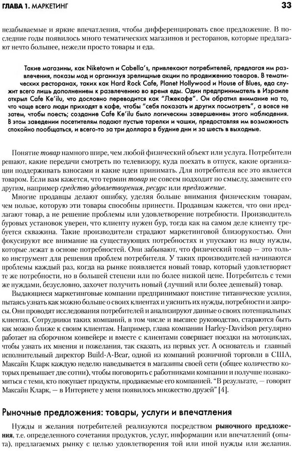 Книгу «Основы маркетинга. Краткий курс» не следует рассматривать как просто общий экскурс. Тема слишком захватывающая, чтобы ограничиться ее схематическим представлением. В книге приводятся случаи из практики, иллюстрирующие драму современного маркетинга: неудача системы кабельного телевидения корпорации Си-би-эс; нескончаемое противоборство между «Кока-колой» и «Пепси-колой»; взлет на рынке пива фирмы «Миллер» с седьмого на второе место; влияние женщин-коммивояжеров фирмы «Эйвон» на покупки, совершаемые не выходя из дома; долговременная кампания фирмы «Коламбия рекордс» по популяризации оркестра «Мен эт уорк»; война цен на рынке бытовых компьютеров и т. д. Каждая глава начинается с описания какого-либо существенного события в сфере маркетинга. Приводимые по ходу каждой главы примеры из реальной действительности наполняют сухие сведения о маркетинге биением жизни.