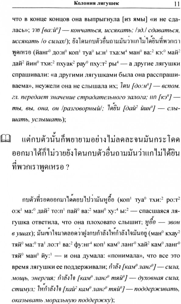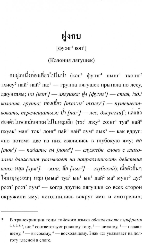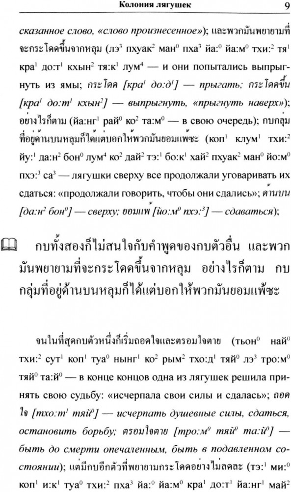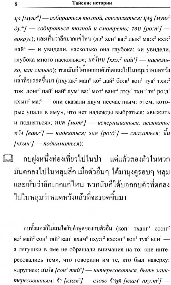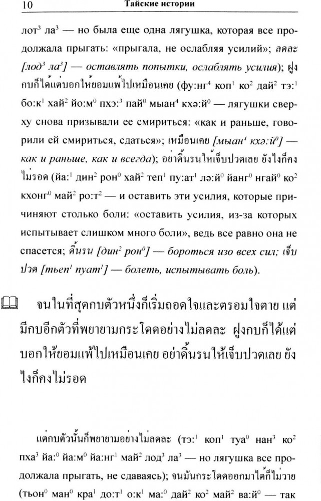 Тайские историиВ данный момент этот товар отсутствует в продаже. Возможно, у нас найдется аналогичный или похожий товар здесь. Серия: Метод обучающего чтения Ильи Франка Это занимательное и несложное чтение поможет читателю войти в мир тайского языка. Сказки и притчи, составившие книгу, адаптированы в настоящем издании по методу Ильи Франка: снабжены транскрипцией, дословным переводом на русский язык и необходимым лексико-грамматическим комментарием (без упрощения текста оригинала). Уникальность метода заключается в том, что запоминание слов и выражений происходит за счет их повторяемости, без заучивания и необходимости использовать словарь. Пособие способствует эффективному освоению языка, может служить дополнением к учебной программе. Для широкого круга лиц, изучающих тайский язык и интересующихся культурой Таиланда. |