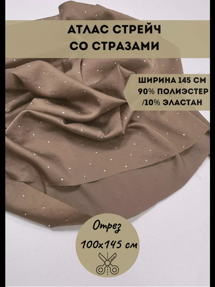 Kopelyan Ткань для пошива со стразами «Атлас стрейч» капучино, плотность 110 гр, отрез 1 метр