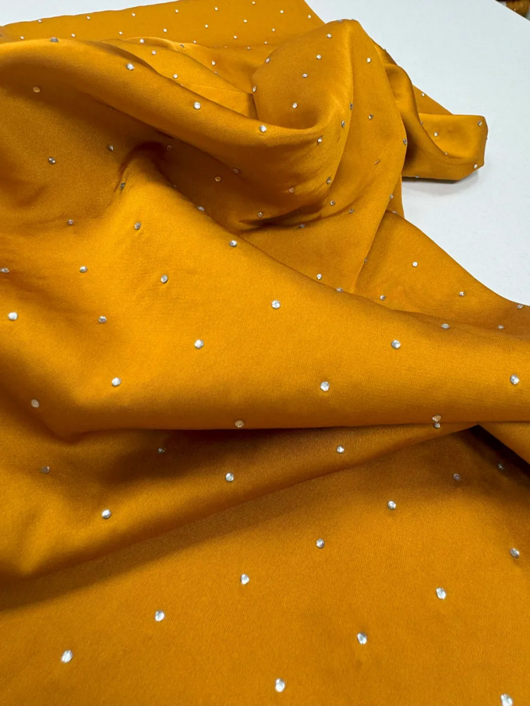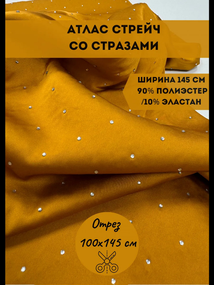 Kopelyan Ткань для пошива со стразами «Атлас стрейч» горчичный, плотность 110 гр, отрез 1 метр