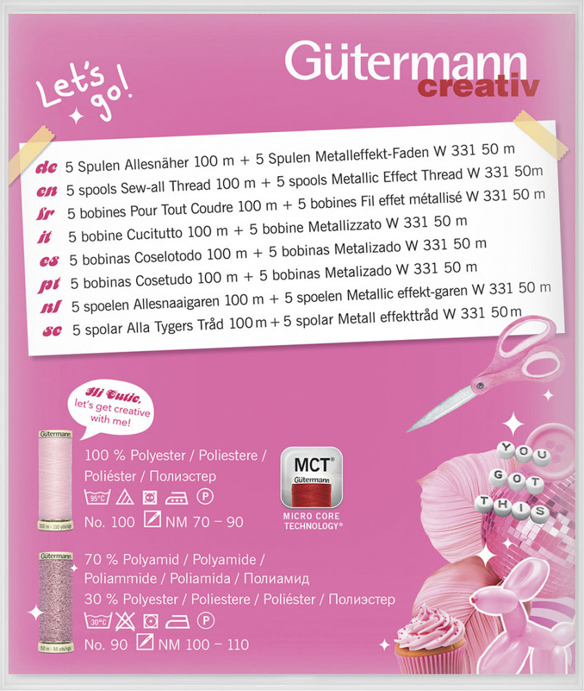 В данный момент этот товар отсутствует в продаже. Возможно, у нас найдется аналогичный или похожий товар здесь. Компактный швейный набор Милый розовый от Gutermann пригодится всем, кто занимается шитьем, рукоделием, ремонтом одежды. Набор включает в себя нити Sew-All (5 катушек) и металлизированную нить W331 (5 катушек) в модном цветовом сочетании для особо креативных швейных проектов.