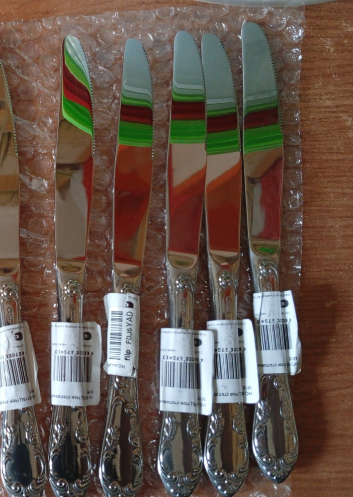 Очень немаленькие, но в то же время изящные ножи. Зеркальные! Пока фотографировала четко видела свое изображение в них))) Красивая форма, довольно тяжёлые, остренький, качество супер!