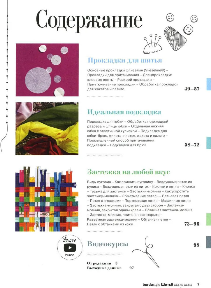 В первой части этой серии мы хотели бы познакомить прежде всего новичков с основами, необходимыми для шитья: как работать с инструкциями и выкройками Burda, какие инструменты и принадлежности понадобятся, как правильно обустроить свое рабочее место, какие виды швов существуют и где они используются. Для более продвинутых читателей мы предлагаем обзор прокладочных материалов, полную информацию о подкладке для разного типа изделий, а также большой раздел, посвященный всевозможным застежкам -от пуговиц и кнопок до молний. Вторая часть нашей уникальной серии, представляющей собой наиболее полное учебное пособие по шитью в четырех частях, наконец-то перед вами!