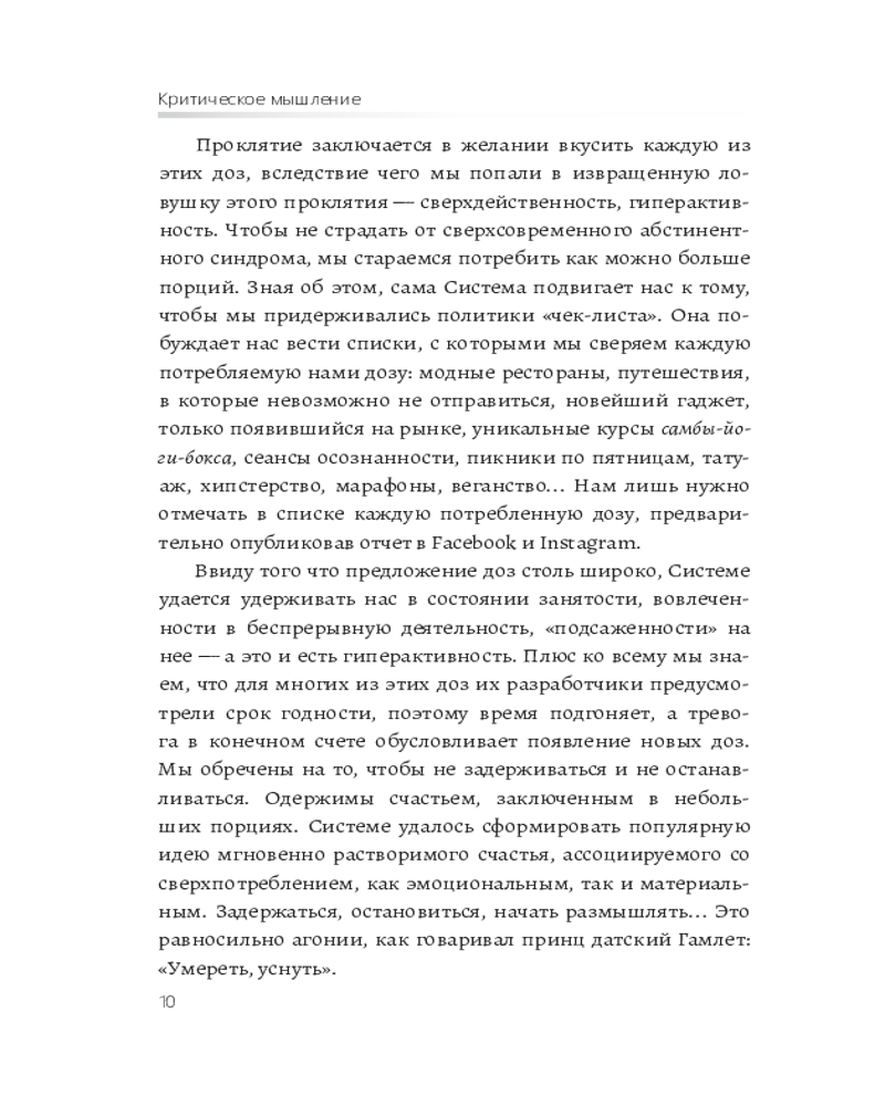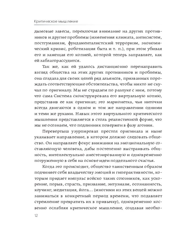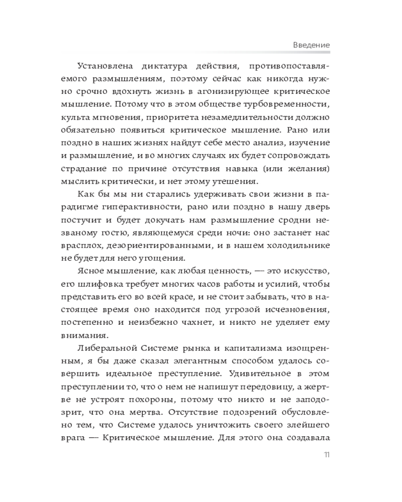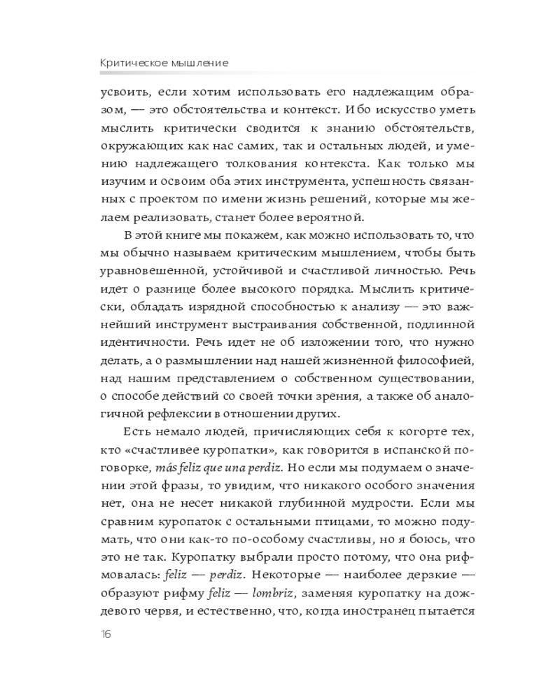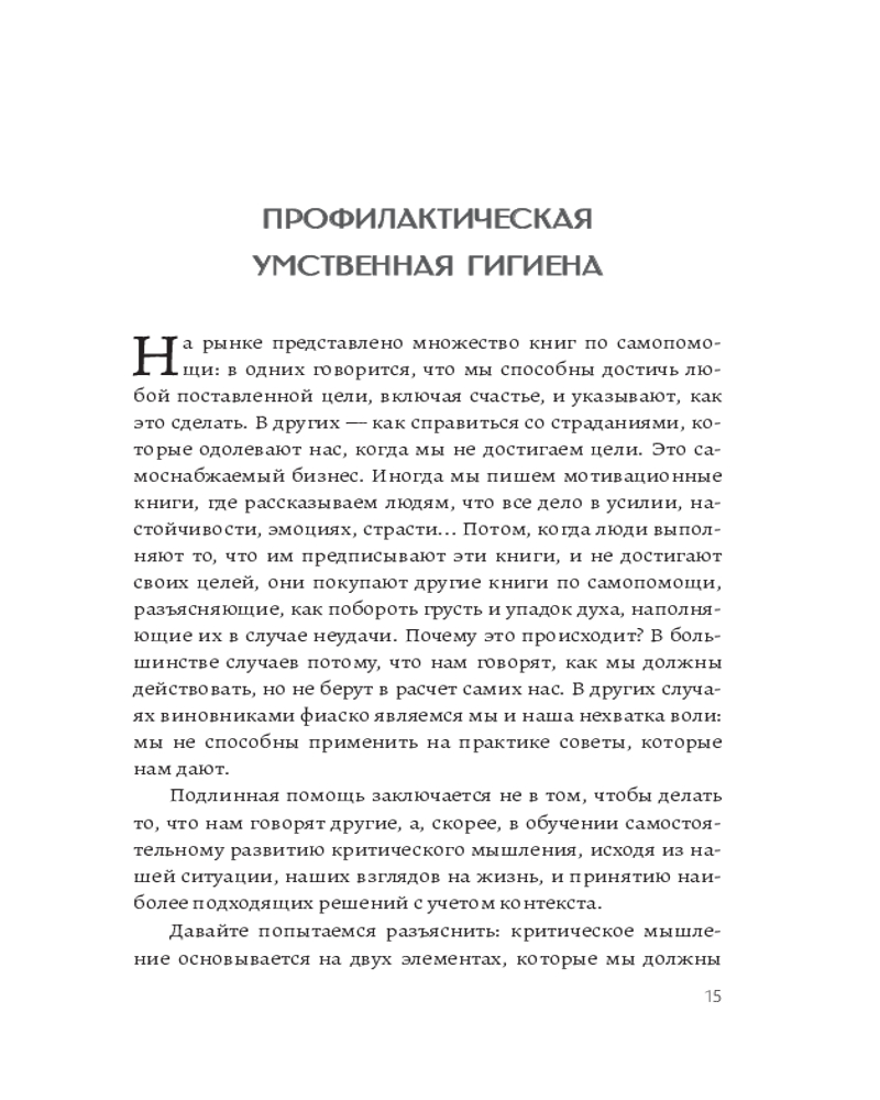 💳 Оплатить за товар можно при получении 🇰🇿 Есть бесплатная доставка по Казахстану от 1 дня 🎁 Копите бонусы с каждой покупки Серия: Психология Существует огромное множество книг по самопомощи. В одних говорится, что мы способны достичь любой цели, которую ставим перед собой, в том числе безграничного счастья, и они рассказывают, как это сделать. Другие пытаются облегчить страдания, которые на нас обрушиваются, когда мы не достигаем такой цели. Тем не менее подлинная помощь заключается не в том, чтобы бездумно выполнять чужие рекомендации, а в том, чтобы научиться самим критически мыслить и принимать решения с учетом конкретной ситуации и своего мировоззрения. Потому что искусство мышления напрямую зависит от окружающих нас обстоятельств и надлежащего толкования контекста. Как только мы освоим оба этих инструмента, эффективность наших решений и задач существенно повысится. |