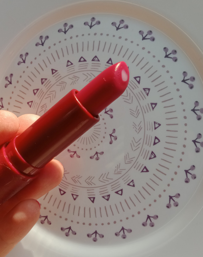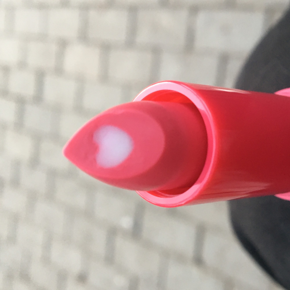 Ложится равномерно, не тающая. Сердечко теряет очертания через ±10 применений. Губы не стягивает, но и не увлажняет. В один слой уже выглядит хорошо, а на 2-3 как насыщенный ягодный, к волосам и коже теплых оттенков не подходит. Пахнет как ежевичная конфета/жевачка.