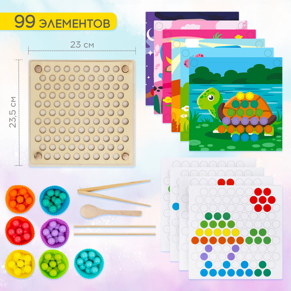 💳 Оплатить за товар можно при получении 🇰🇿 Есть бесплатная доставка по Казахстану от 1 дня 🎁 Копите бонусы с каждой покупки Развивающая Сортер-мозаика 3 в 1 создана по методике Монтессори, доказавшей свою эффективность в обучении детей. Игрушка сделана из дерева и представляет собой мозаику, сортер и инструмент для обучения цветам и счету. С помощью многофункциональной игры ребенок сможет выстраивать рисунок цветными шариками, изучать цифры с помощью сортировки, развить пространственное мышление и природную пытливость ума в свободной игре с элементами в наборе. |
