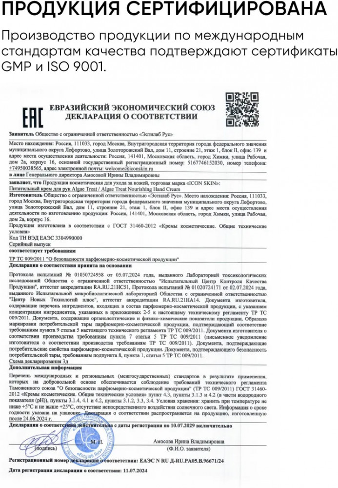 Icon Skin Крем для рук питательный «Algae Treat Nourishing Hand Cream»