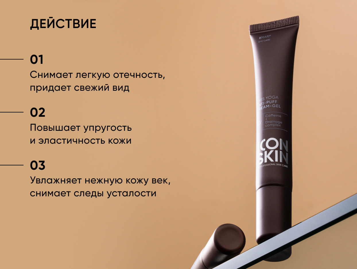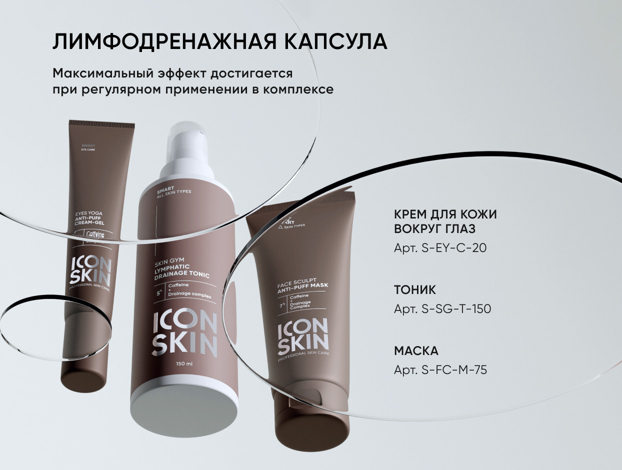 Формула усилена кофеином и дренажным комплексом в суммарной концентрации 10%, в состав входят троксерутин, мощные витамины-антиоксиданты и гиалуроновая кислота. Задача формулы — «пробуждение» кожи вокруг глаз: восстановление тонуса, увлажненности и упругости, сияние и эффект свежего отдохнувшего взгляда. Крем-гель способствует выведению лишней влаги, укреплению стенок капилляров, усилению микроциркуляции и поддержанию защитного барьера кожи в ответ на окислительный стресс. Нежная гелевая текстура быстро впитывается и не утяжеляет кожу, что особенно важно при склонности к образованию отеков. Icon Skin Smart — серия средств направленного действия для всех типов кожи. В основе смарт-формул — активные компоненты с научно доказанной эффективностью.