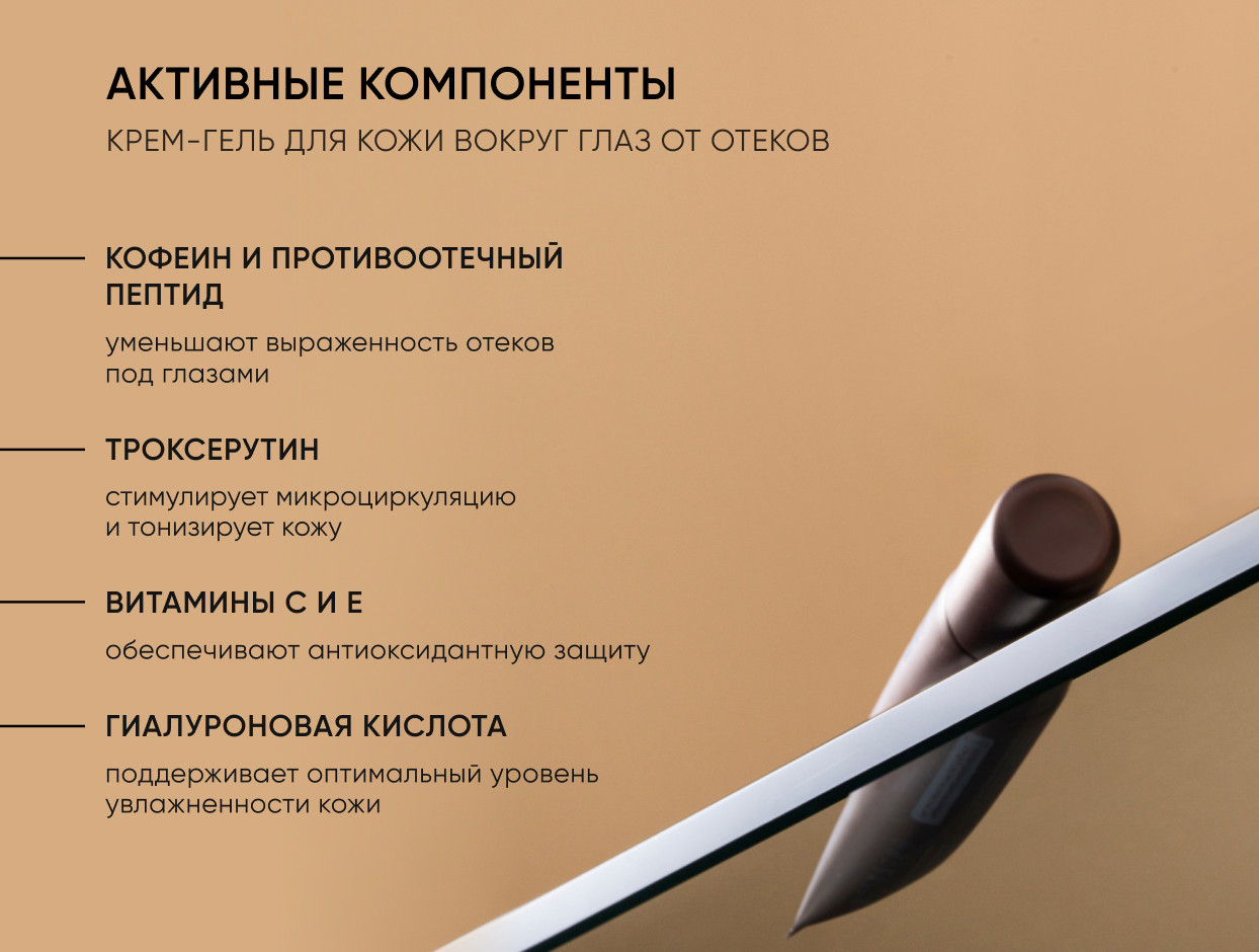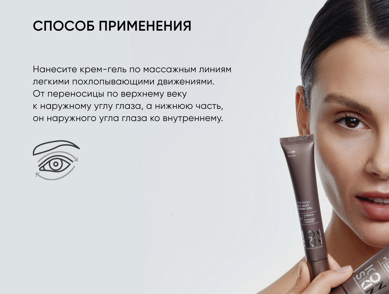 Показания к применению: крем-гель рекомендован для всех типов кожи, особенно в качестве экспресс-ухода для устранения отеков, припухлостей вокруг глаз и других следов усталости. Возраст: от 14 лет.