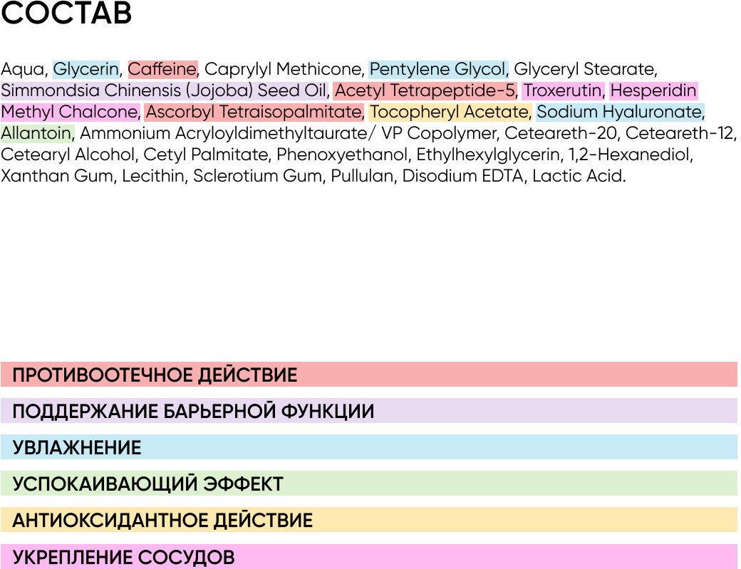 • троксерутин: повышает эластичность сосудов, оказывает противоотечное действие, стимулирует микроциркуляцию и тонизирует кожу;