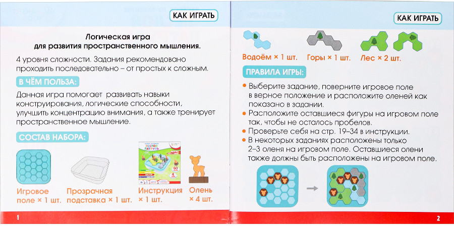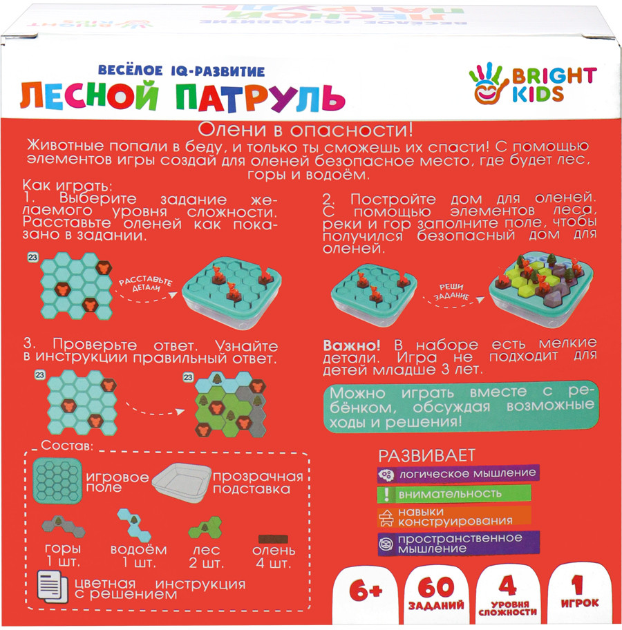 💳 Оплатить за товар можно при получении 🇰🇿 Есть бесплатная доставка по Казахстану от 1 дня 🎁 Копите бонусы с каждой покупки Серия: Весёлое IQ-развитие Головоломка серия «Веселое IQ-развитие». Игра развивает кругозор и логическое мышление, тренирует концентрацию внимания и мелкую моторику. Задания охватывают самые разнообразные темы: цифры, цвета, формы, место в пространстве, количество, части целого, эмоции, время и многое другое. Поместите фигурки оленей на поле так, как указано в одном из заданий. Разместите все оставшиеся детали головоломки на игровом поле и помните — у каждого задания есть только одно правильное решение. В игре содержатся 60 заданий 4 уровней сложности. |