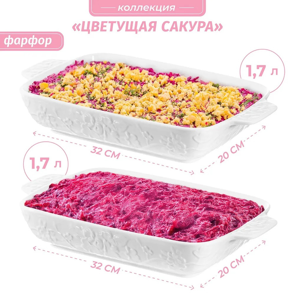 Набор прямоугольных шубниц с ручками Цветущая сакура предназначен для приготовления и подачи горячих и холодных блюд. Шубницы выполнены из белого фарфора. Красивая декоративная посуда украсит ваш стол как на праздник, так и в будни! Шубницы подойдут для самых разнообразных блюд: селёдки под шубой, салатов или плова. Их также можно использовать как глубокую сервировочную посуду для закусок из мяса и рыбы или десертов. В них можно красиво подать холодец, заливное и желе. Каждая шубница украшена рельефным узором в виде цветков сакуры. Благодаря изящному дизайну шубницы подойдут для сервировки стола: они будут сочетаться с любой скатертью и отлично дополнят интерьер вашей кухни или гостиной. Высококачественный фарфор легко отмывается и не впитывает цвет продуктов, поэтому шубницы надолго сохранят свою белизну. Не рекомендуется применять абразивные моющие средства. Подойдут для использования в микроволновой печи и посудомоечной машине. Набор поставляется в плотной картонной упаковке. Он станет отличным подарком на Новый год или Рождество и обязательно порадует любую хозяйку! Серия Цветущая сакура позволит собрать сервиз в едином стиле и сможет стать настоящим украшением вашего дома.