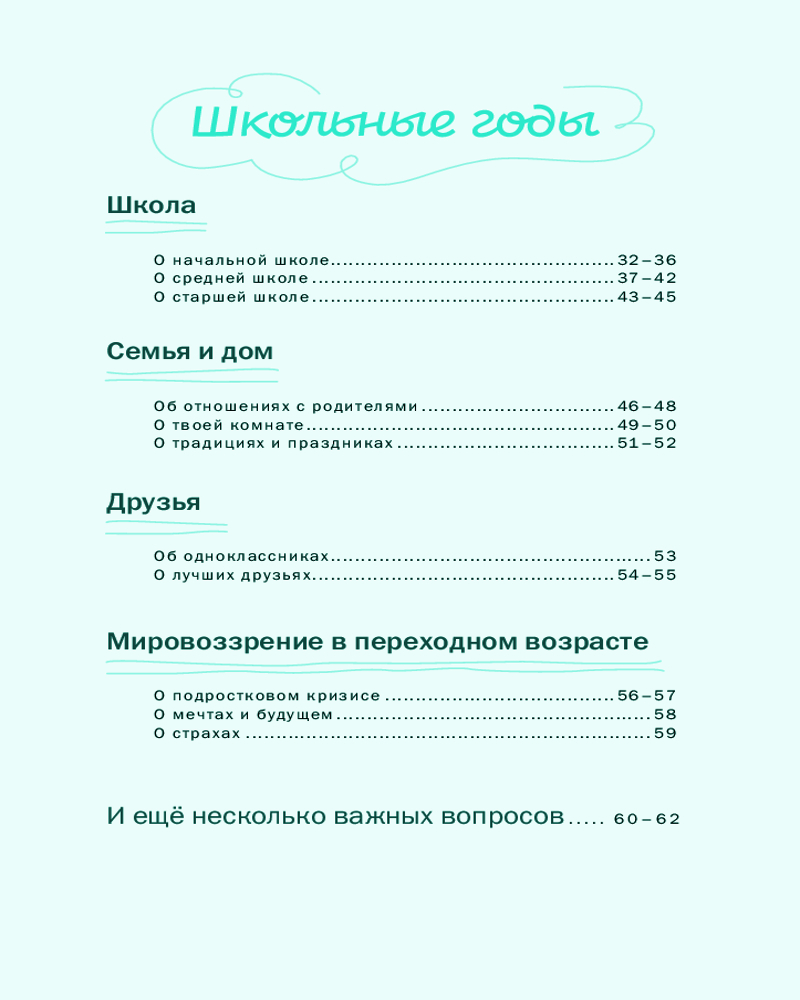 • школьные годы: школа, семья и дом, друзья, мировоззрение в переходном возрасте;