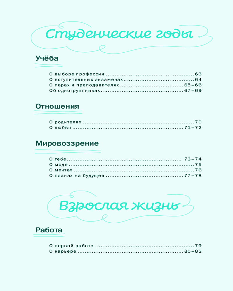• взрослая жизнь: работа, личная жизнь, мировоззрение;