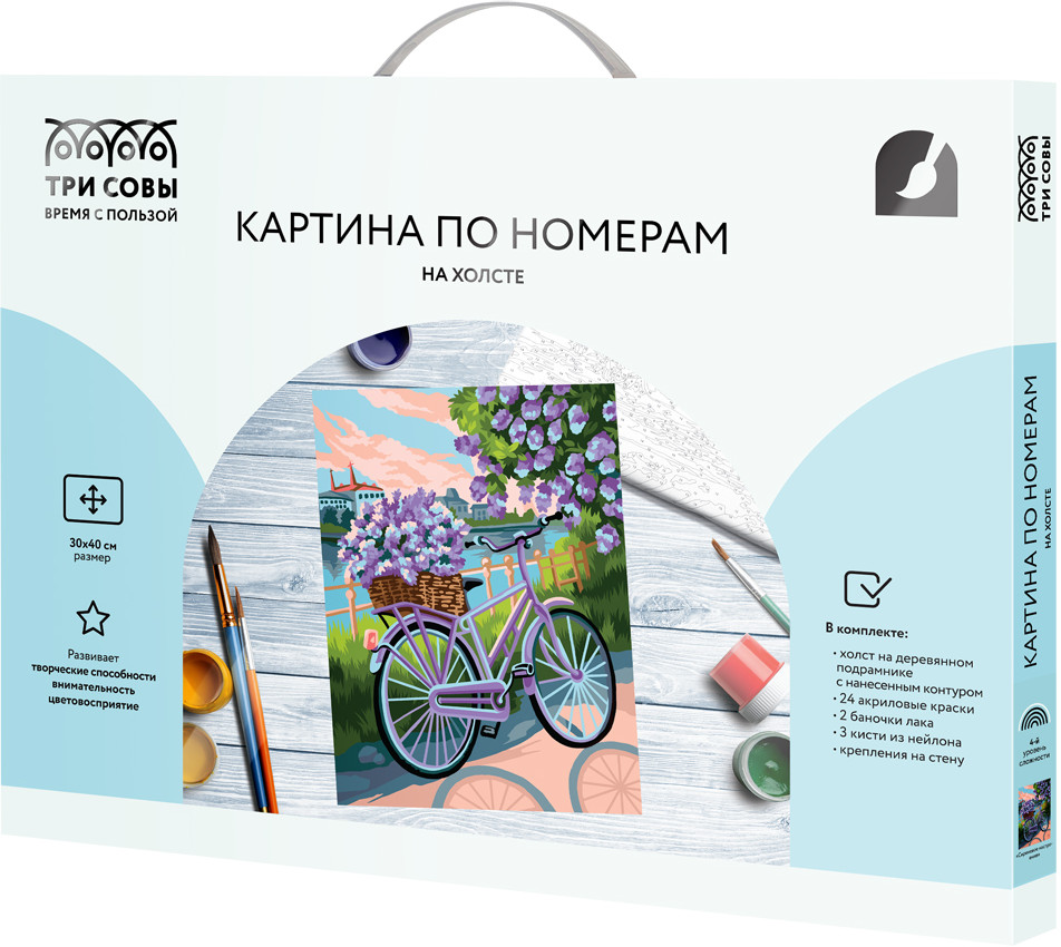 • холст на деревянном подрамнике 30 × 40 см с нанесенным контуром, пронумерованный в соответствии с номерами красок. Контур под раскрашивание нанесен и на торцы подрамника, что позволяет разместить готовую работу на стене, не обрамляя в багет или раму. Технология точной разбивки сюжета картины на разные цветовые оттенки гарантируют правильность исполнения полотна;