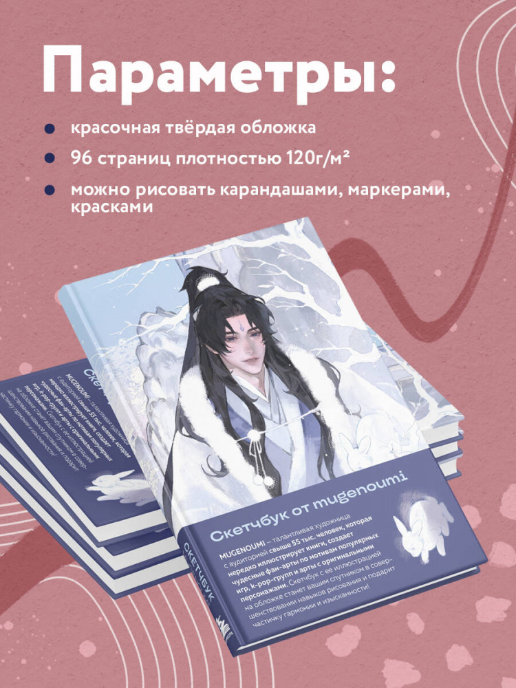💳 Оплатить за товар можно при получении 🇰🇿 Есть бесплатная доставка по Казахстану от 1 дня 🎁 Копите бонусы с каждой покупки Серия: Маньхуа. Лучшее для поклонников китайских новелл Специально для поклонников китайских новелл и маньхуа! Авторский скетчбук от mugenoumi! Он вдохновит на создание собственной истории, со своими героями и сюжетными линиями. Mugenoumi — талантливая художница с аудиторией свыше 55 тыс. человек, которая нередко иллюстрирует книги, создает чудесные фанарты по мотивам популярных игр, K-pop групп и арты с оригинальными персонажами. Ее изящные работы не только вызывают у людей эстетическое наслаждение, но и погружают в хрупкую и мимолетную красоту азиатской культуры. Скетчбук с иллюстрацией художницы на обложке станет вашим спутником в совершенствовании навыков рисования и подарит частичку гармонии и изысканности. |