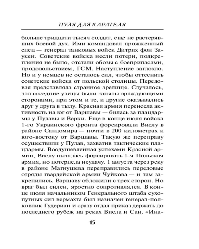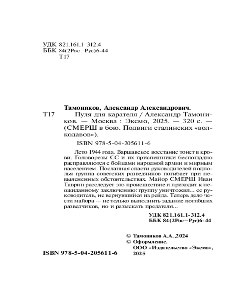 💳 Оплатить за товар можно при получении 🇰🇿 Есть бесплатная доставка по Казахстану от 1 дня 🎁 Копите бонусы с каждой покупки Серия: СМЕРШ в бою. Подвиги сталинских «волкодавов» Лето 1944 года. Варшавское восстание тонет в крови. Головорезы СС и их приспешники беспощадно расправляются с бойцами народной армии и мирным населением. Посланная спасти руководителей подполья группа советских разведчиков погибает при невыясненных обстоятельствах. Майор СМЕРШа Иван Таврин расследует это происшествие и приходит к неожиданному заключению: группу уничтожил... ее руководитель, не вернувшийся из рейда. Теперь дело чести майора — не только выполнить задание погибших разведчиков, но и разыскать предателя... |
